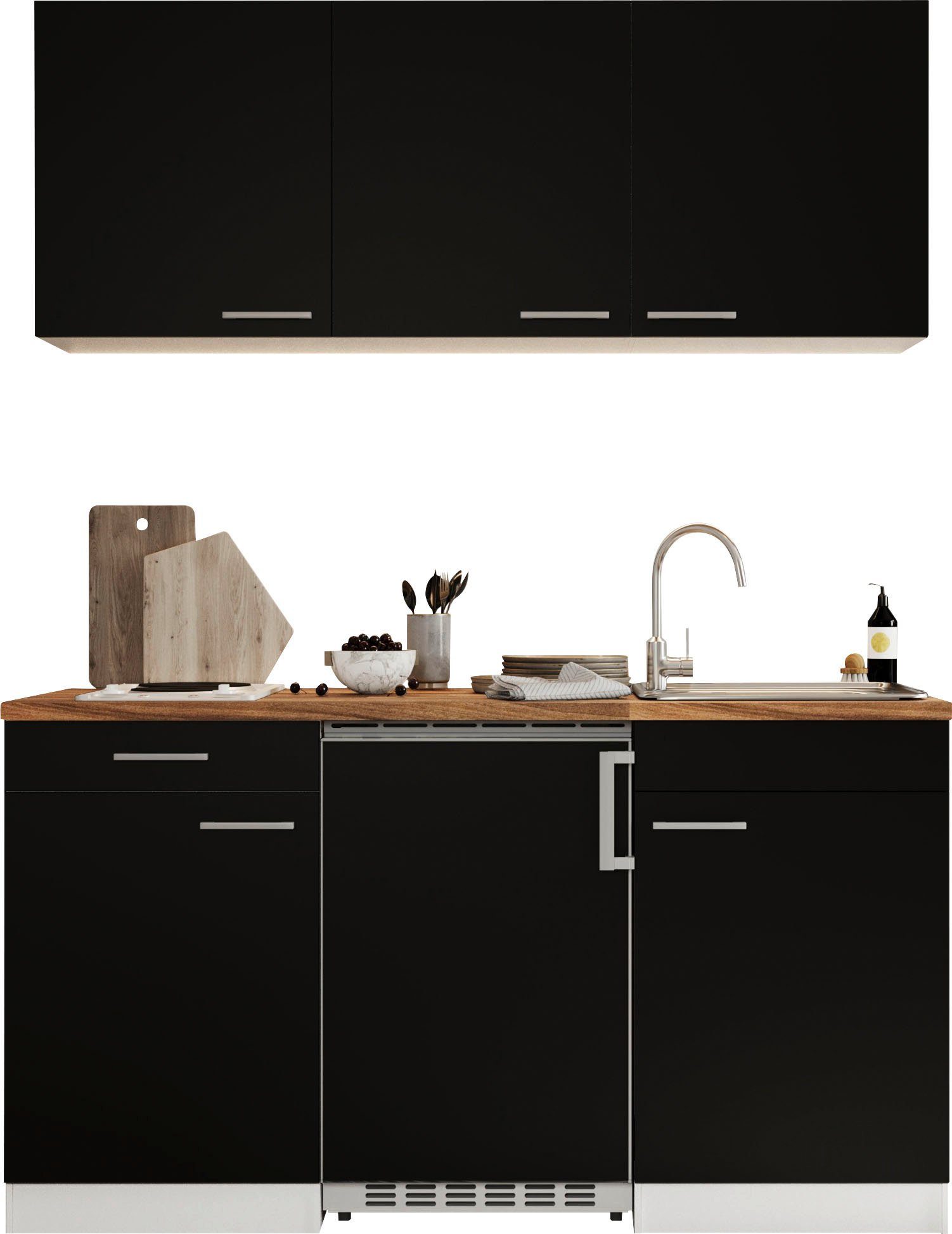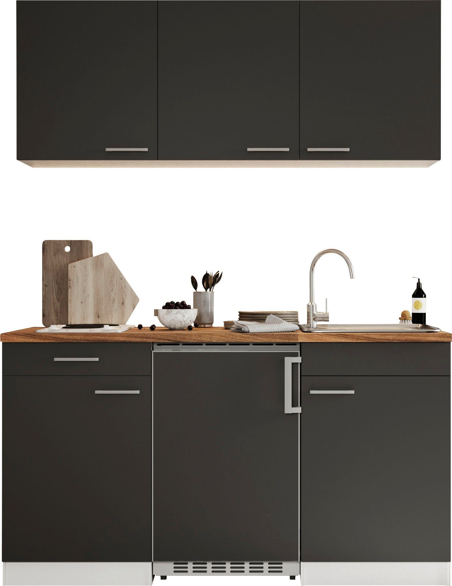 Die umfangreiche Küche »Luis« von RESPEKTA bietet dir mehrere Hänge- und Unterschränke für deine Utensilien. Eine großzügig gestaltete Schublade ergänzt praktischen Stauraum. Damit du backen und kochen kannst, ist die stilvoll gestaltete Küchenzeile bereits mit E-Geräten wie einem Duo-Kochfeld und einem Kühlschrank ausgestattet. Auf der zugehörigen Arbeitsplatte kannst du deine Lebensmittel zubereiten und in der Edelstahl-Einbauspüle mit Abtropffläche abwaschen. Auf Wunsch ist die Küche seitenverkehrt stellbar und lässt sich damit unterschiedlichen Raumgegebenheiten anpassen. Griffe im Alu-Design akzentuieren die moderne Optik. Praktisches Komplettpaket: die umfangreiche Küche »Luis« von RESPEKTA.