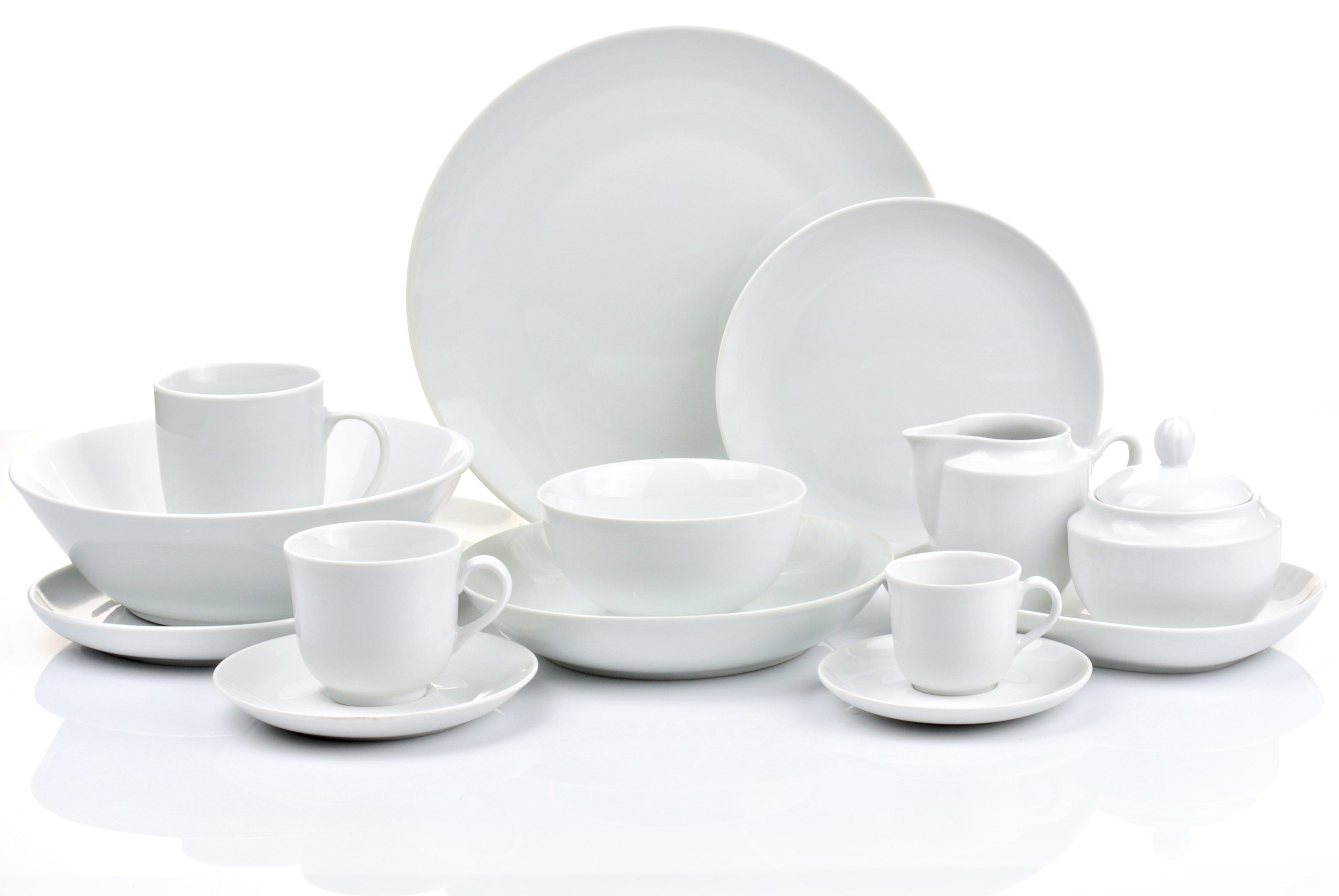 Retsch Arzberg Kombigeschirrset 60 tlg. runde Coup-From, weiß, platzsparend, Spülmaschinengeeignet, Mikrowellengeeignet, Widerstandsfähig • Kombiservice für 6 Personen bestehend aus 60 Teilen, platzsparend, Spülmaschinengeeignet, Mikrowellengeeignet, widerstandsfähig • Sie erhalten je 6 Stück von Speiseteller, Suppenteller, Müslischüsseln, Frühstücks-/ Dessertteller, Kaffeebecher, Espressotassen, Kaffeetassen, 2 Stück Salatschalen, 2 Stück Platten oval, 1 Stück Zuckerdose mit Deckel und 1 Stück Milchkännchen • Mit diesem zeitlosen Geschirrset sind Sie für alle Eventualitäten, wie Frühstück, Brunch, Mittagessen, Kaffee und Kuchen oder Abendessen ausgestattet • Material: Porzellan / klassische runde Form, Hersteller: Retsch Arzberg Kombiservice für 6 Personen bestehend aus 60 Teilen. Das Geschirr aus dem Hause Retsch Arzberg überzeugt durch seine bekannte, sehr gute Verarbeitung und Qualität. Egal ob privat für den täglichen Gebrauch, als "zweites Geschirr" für besondere Anlässe, oder im Geschäftsbereich für Ihre Gastronomie, Kantine oder Betriebs-Pausenraum. Mit diesem zeitlosen Geschirrset sind Sie für alle Eventualitäten, wie Frühstück, Brunch, Mittagessen, Kaffee und Kuchen oder Abendessen ausgestattet. In diesem Set enthalten sind: - 6 x Speiseteller (Ø27cm) - 6 x Suppenteller (Ø20cm) - 6 x Müslischüsseln (Ø12,5cm) - 6 x Frühstücks-/Dessertteller (Ø19,5cm) - 6 x Kaffeebecher (ca. 300ml, Höhe 10cm, Ø8cm ) - 6 x Kaffeetasse (ca. 200ml, Höhe 7,5cm, Ø7,5cm) - 6 x Kaffeeuntertasse (ca. 14cm) - 6 x Espressotasse (ca.120ml, Höhe 6cm, Ø5,5cm) - 6 x Espressountertasse (ca. 12cm) - 2 x Salatschale (Ø23cm) - 1 x Platte oval (28cm) - 1 x Platte oval (22cm) - 1 x Zuckerdose mit Deckel (Höhe 7,5cm, Ø10cm) - 1 x Milchkanne (Höhe 9cm, Ø8cm) Das Set ist platzsparend, widerstandsfähig, spülmaschinengeeignet und mikrowellengeeignet. Material: Porzellan