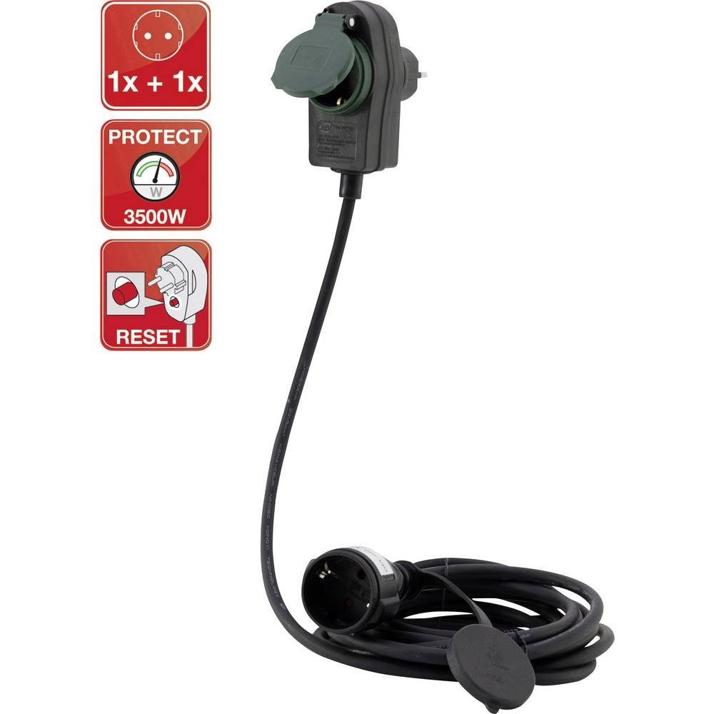 Eigenschaften | Anschlusstyp A (bzw. Eingänge): Schutzkontakt-Steckdose · Anschlusstyp B (bzw. Ausgänge): Schutzkontakt-Stecker · Einsatzort: Innenbereich, Außenbereich · Herstellerfarbe: Schwarz · Kabel-Anwendung: Strom · Kabel-Ausführung: Verlängerungskabel · Kabel-Typ nach DIN/VDE: H05RR-F 3G 1,5 mm² · Kabellänge: 10.00 m · Schutzart: IP44 |