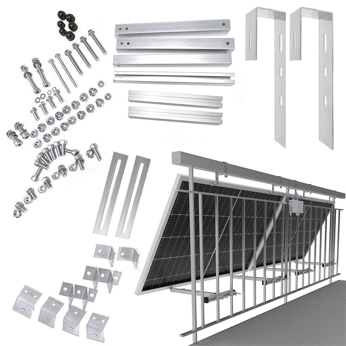 Lieferumfang | 2 Balkon-Haken mit vormontierten Schutzstreifen 2 Haken-Sicherungsschrauben M8 x 90 inkl. Muttern & Unterlegscheiben 2 vormontierte Aufständerungen 3 Schrauben M8 x 20 mit Muttern & Scheiben 2 Alu-Profilschienen (300mm) mit Schutzstreifen 2 Alu-Befestigungselemente mit Schrauben & Schutzsteifen 2 Alu-Klemmen mit Schrauben (geeignet für Modulhöhe von 30-35mm) 4 gummierte Endkappen für Profilschienen |