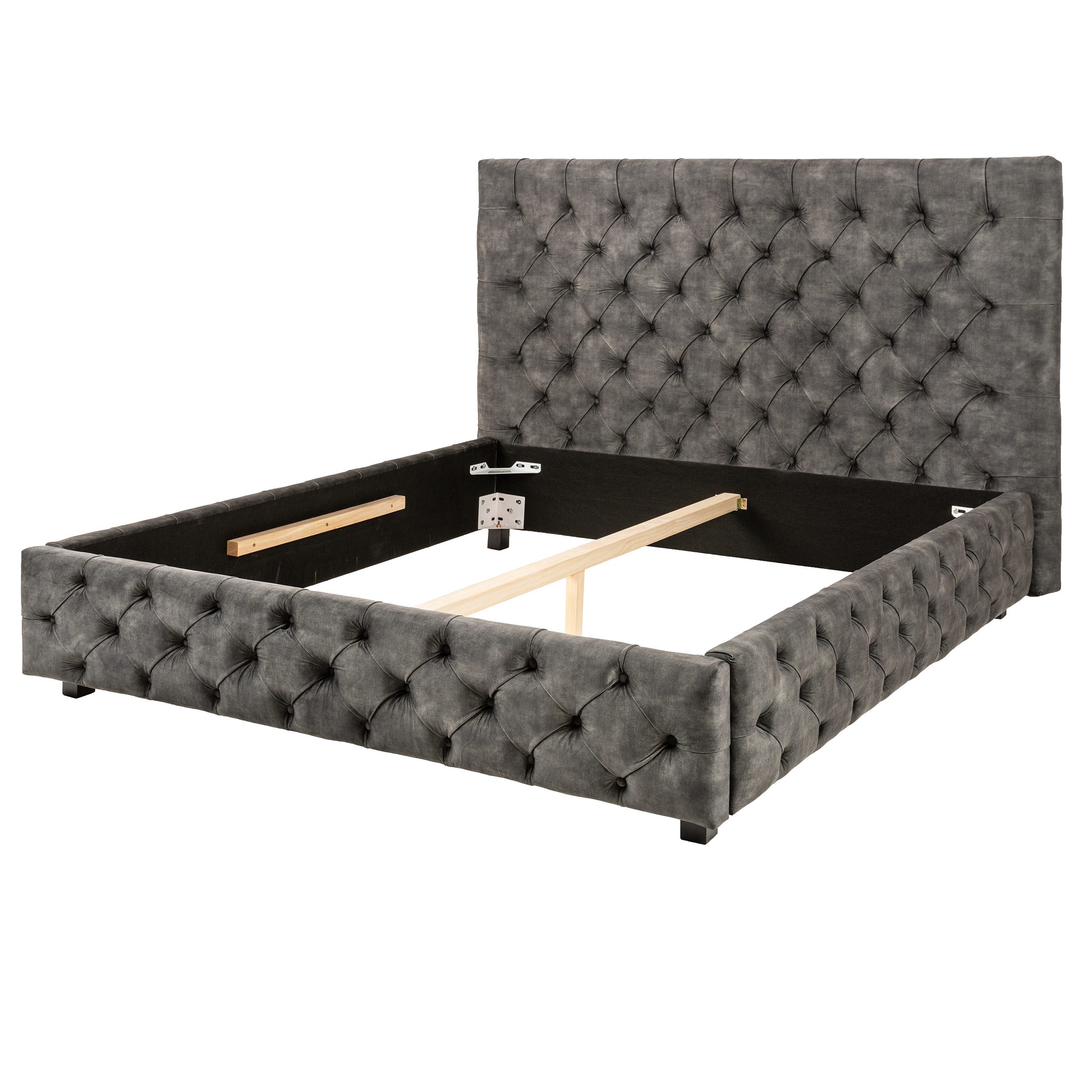 Dieses Design Doppelbett vereint gekonnt Design und Funktionalität: Während das gesamte Bettgestell mit einem edlen Samtbezug bezogen und zusätzlich versteppt ist, verfügt es über eine ausladend hohe Rückenlehne, die zum Verweilen einlädt. Die dick eingepolsterten Zierknöpfe verleihen dem Bett den charismatischen Chesterfield Stil, der weltweit für seine elegante Ausstrahlung bekannt ist.