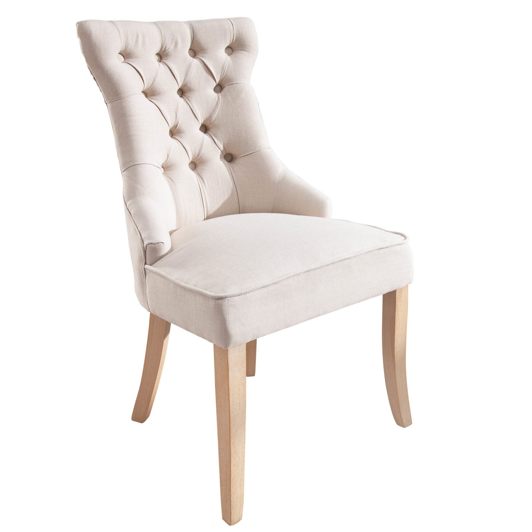 Nimm Platz und freue Dich auf einen neuen Lieblingsplatz am Esstisch! Unsere bequemen Stühle aus der Serie CASTLE vereinen dank Nosagfederung höchsten Sitzkomfort mit einem eleganten, gemütlichen Design. Die hohe Rückenlehne und die Polsterung sorgen für besten Komfort, zudem ist er mit wunderschönen Zierknöpfen versehen, die an das weltbekannte Chesterfield Design erinnern. Der beige Bezugsstoff und die Holzfüße hingegen verleihen dem Stuhl seinen charmanten Landhaus-Look.