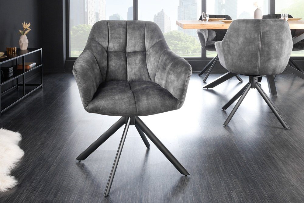 Der um 180° drehbare Esszimmerstuhl PAPILLON ist ein echter Blickfang an jedem Esstisch. Seine hochwertig gepolsterte Sitzschale ist mit einem glamourösen Samt-Stoff bezogen und sorgt für gemütliche Stunden in Deinem Essbereich. Die dekorative Ziersteppung, das schwarze Drehkreuz-Gestell aus Metall und die Ziernaht auf der Rückseite verleihen dem Stuhl einen besonderen Look. Die Kombination aus Samt-Stoff und den dunklen Metallbeinen verleiht Deinem Esszimmer ein modernes Flair mit höchstem Sitzkomfort!