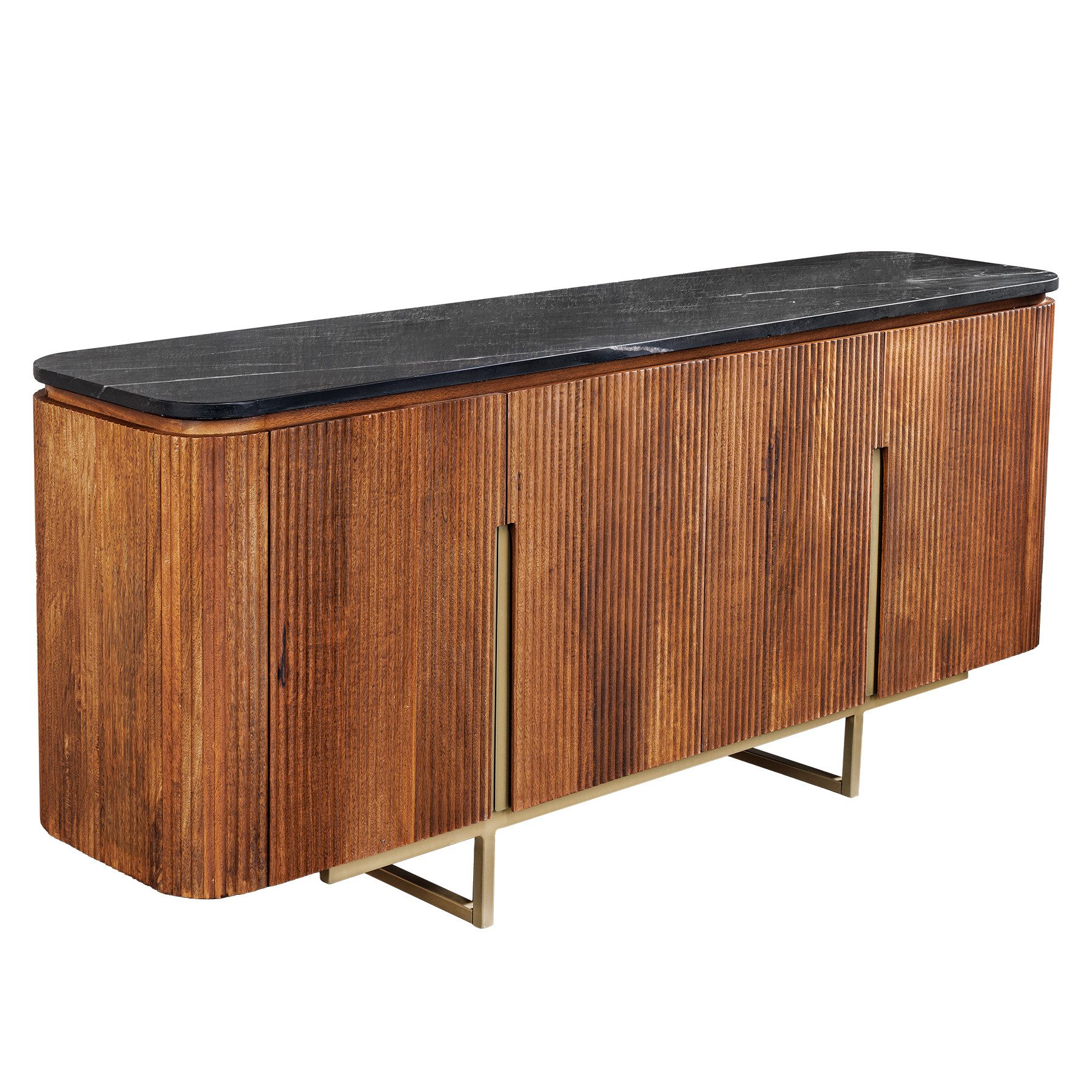 Das Sideboard GATSBY kombiniert moderne Eleganz mit einem Hauch von Retro-Charme. Der schwarz lackierte Korpus aus massivem Mangoholz überzeugt durch seine markante Maserung und hochwertige Verarbeitung. Die abgerundeten Seiten und die geriffelten Fronten verleihen dem Möbelstück seine besondere Formensprache. Für einen edlen Abschluss sorgt das filigrane Metallgestell in goldfarbener Lackierung, das dem Design einen warmen, luxuriösen Akzent verleiht.