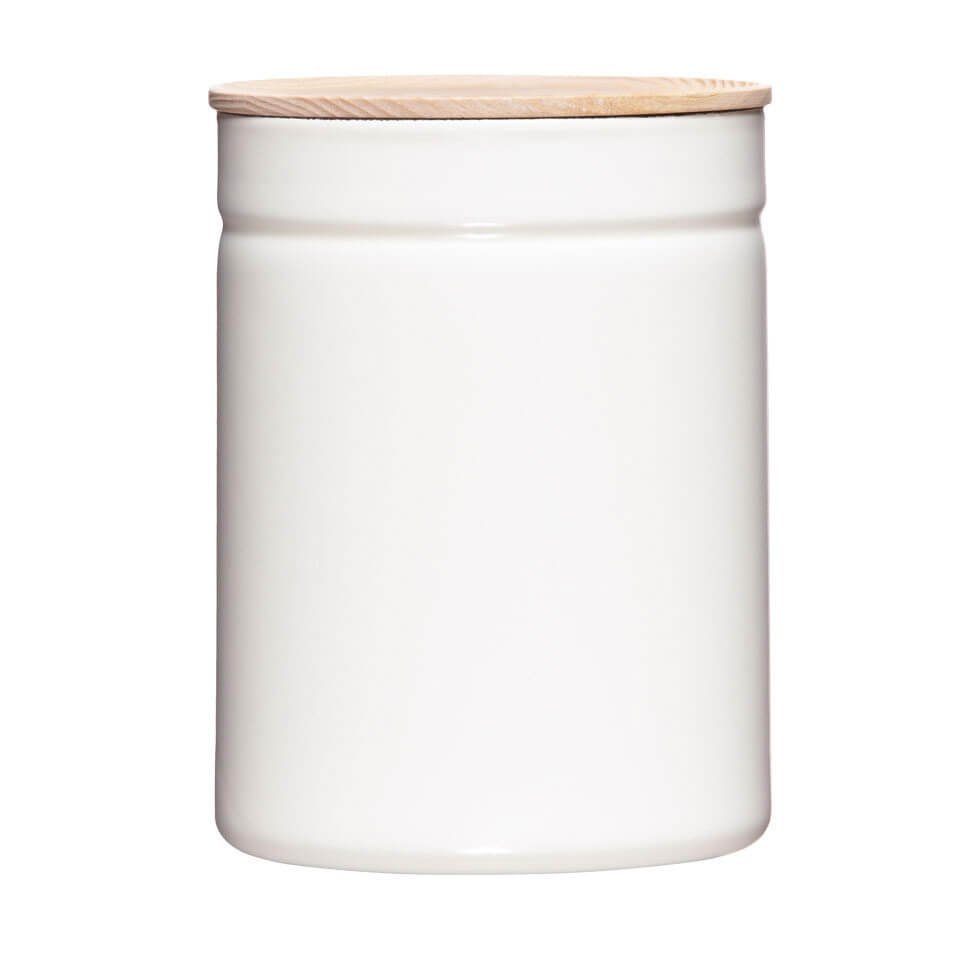 Die Pure White Maxi Варіанти mit 13 cm Durchmesser und 18 cm Höhe und einem Volumen von 2250 ml, geeignet etwa für 1 kg Packungen Zucker, Mehl etc. Die Dosen sind aus Emaille und der Deckel aus hochwertigem Eschenholz. Der Werkstoff Emaille besteht aus Eisen, das bei hohen Temperaturen mit Glas verschmolzen wurde, also aus natürlichen Rohstoffen.