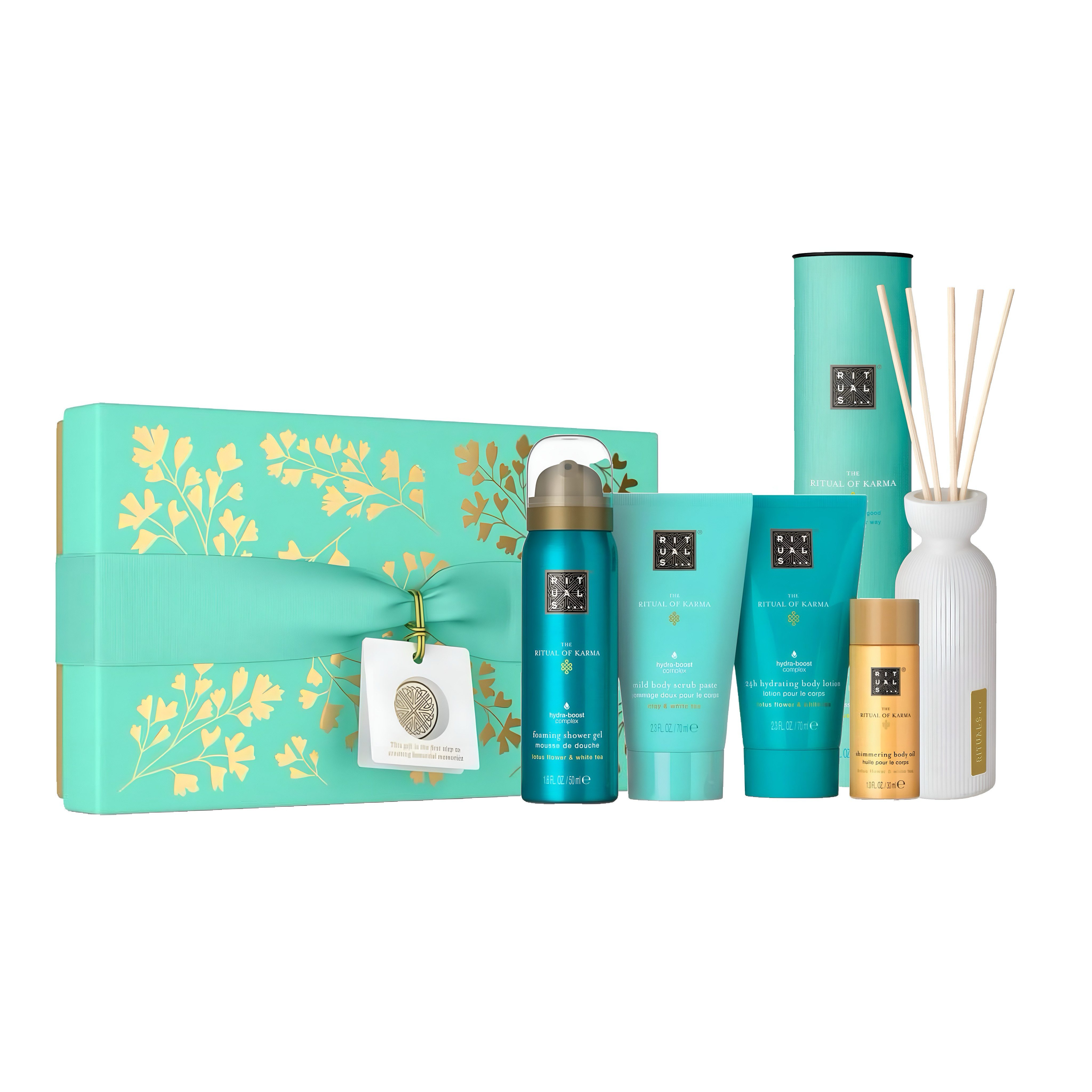 Lieferumfang | • The Ritual of Karma Duschgel (50 ml) • The Ritual of Karma Schimmeröl (30 ml) • The Ritual of Karma Scrub Clay (70 ml) • The Ritual of Karma Körperlotion (70 ml) Duftstäbchen (70 ml). |