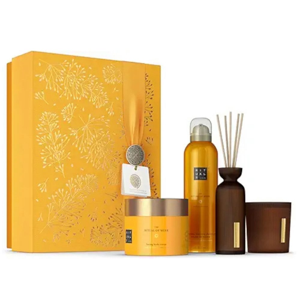 Inhaltsstoffe | Süße Orange: Bekannt für ihre erfrischende Wirkung und reich an Vitamin C, spendet Feuchtigkeit und verleiht der Haut ein strahlendes Aussehen. Zedernholz: Hat beruhigende und ausgleichende Eigenschaften, es fördert das Wohlbefinden und unterstützt die Hautpflege mit seinem holzigen Duft. Weißer Lotus: Oft in Hautpflegeprodukten verwendet, um Feuchtigkeit zu spenden und die Haut zu pflegen. Die genaue Liste der Inhaltsstoffe kann je nach Produkt leicht variieren, aber diese Zutaten sind charakteristisch für das Ritual of Mehr. Wenn du weitere Details benötigst, kann ich die spezifischen Inhaltsstoffe eines einzelnen Produkts nachschlagen. |