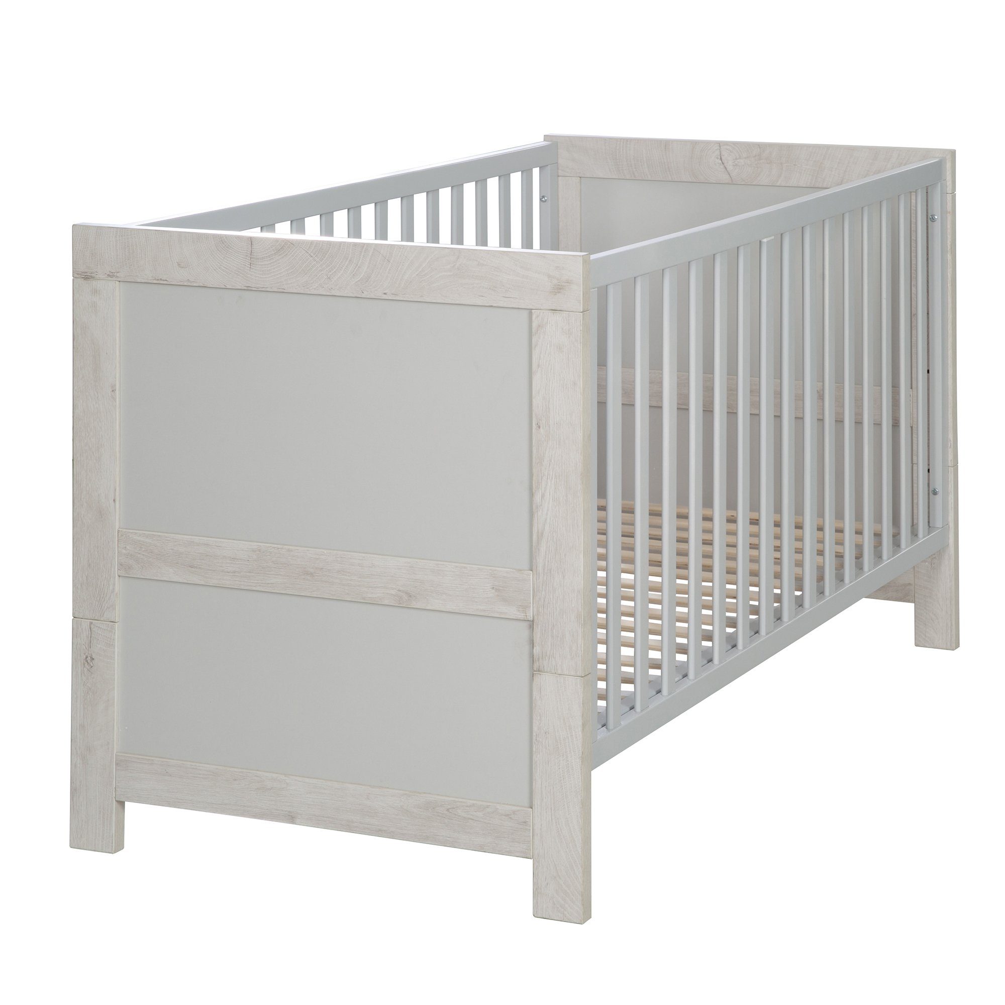 Das roba Kombi-Kinderbett 'Mila' in Rahmenoptik ist mit seinen modernen, ruhigen Farben das Highlight im Baby- oder Kinderzimmer. Der Rahmen ist im Trenddekor 'weißgekalkte Eiche mit Echtholzhaptik' und die Fronten und Gitterstäbe in modernem 'Lichtgrau' gehalten. Das mitwachsende Kinder- und Babybett begleitet Ihr Baby von Geburt an bis es in die Schule kommt. Als besonders rückenschonend für Sie als Eltern erweist sich die obere Liegeposition des 3-fach höhenverstellbaren Gitterbetts. Aus dieser angenehmen Liegehöhe können Sie ihr Baby mühelos aus dem Bettchen heben. Später ist die mittlere Position die perfekte Wahl, denn mittels der 3 herausnehmbaren Schlupfsprossen im Gitterelement des Babybetts ermöglichen Sie Ihrem Kleinkind den sicheren Ein- und Ausstieg. Die unterste Position des höhenverstellbaren Kinderbetts ist für das Juniorbett vorgesehen. Ist ihr Baby dann größer, lässt sich das Kombi-Kinderbett mit den mit separat erhältlichen Umbauseiten (Art. Nr. 10012GA) in ein Juniorbett umbauen. Kopf- und Fußteil des Kombi-Kinderbetts sind teilbar. Beim Umbau zum Juniorbett kommen die oberen beiden Hälften des Kopf- und Fußteils zum Einsatz und sorgen für einen neuen Look im Kinderzimmer. Das Kombi-Kinderbett 'Mila' findet bis zum 7. Lebensjahr Ihres Kindes (bzw. bis zu einem Körpergewicht von 50 kg) Verwendung. Das roba Kinder- und Juniorbett ohne sichtbare Schrauben in der Front hat die Liegefläche 70 x 140 cm. Wenn Sie das Babybett in ein Himmelbett verwandeln möchten, bieten sich unsere 4-teiligen roba Kinderbettgarnituren bestehend aus Kissen, Decke, Himmel und Nestchen an. Das roba Kombi-Kinderbett ist in Deutschland entwickelt und entspricht den aktuellen Sicherheitsstandards nach EN 716 – 1:2017 + AC:2019. Das Gitterbett 'Mila' ist montagefreundlich. (HxBxT): 82 x 76 x 144 cm. Rahmen im Trenddekor 'weißgekalkte Eiche mit Echtholzhaptik'. Fronten und Gitterstäbe in modernem 'Lichtgrau'. Liegefläche 70 x 140 cm.