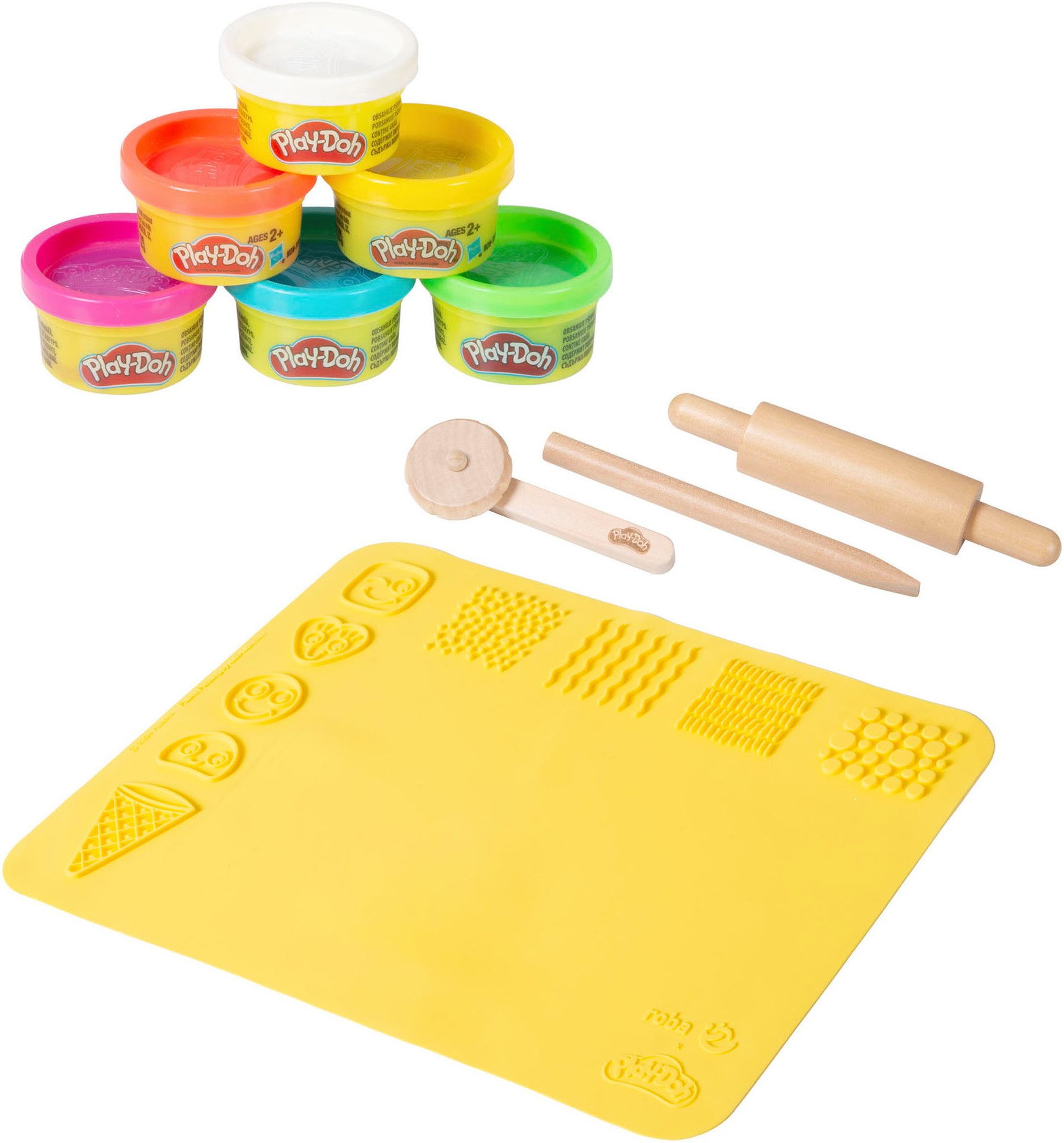 3D-Kreativmatte (klein), Teigrolle, Pizzaschneider, Modellierwerkzeug aus FSC-zertifiziertem Holz, 6x Play-Doh Knete (je 1 Dose - ca. 28 g in Rot, Gelb, Blau, Grün, Weiß, Berry)