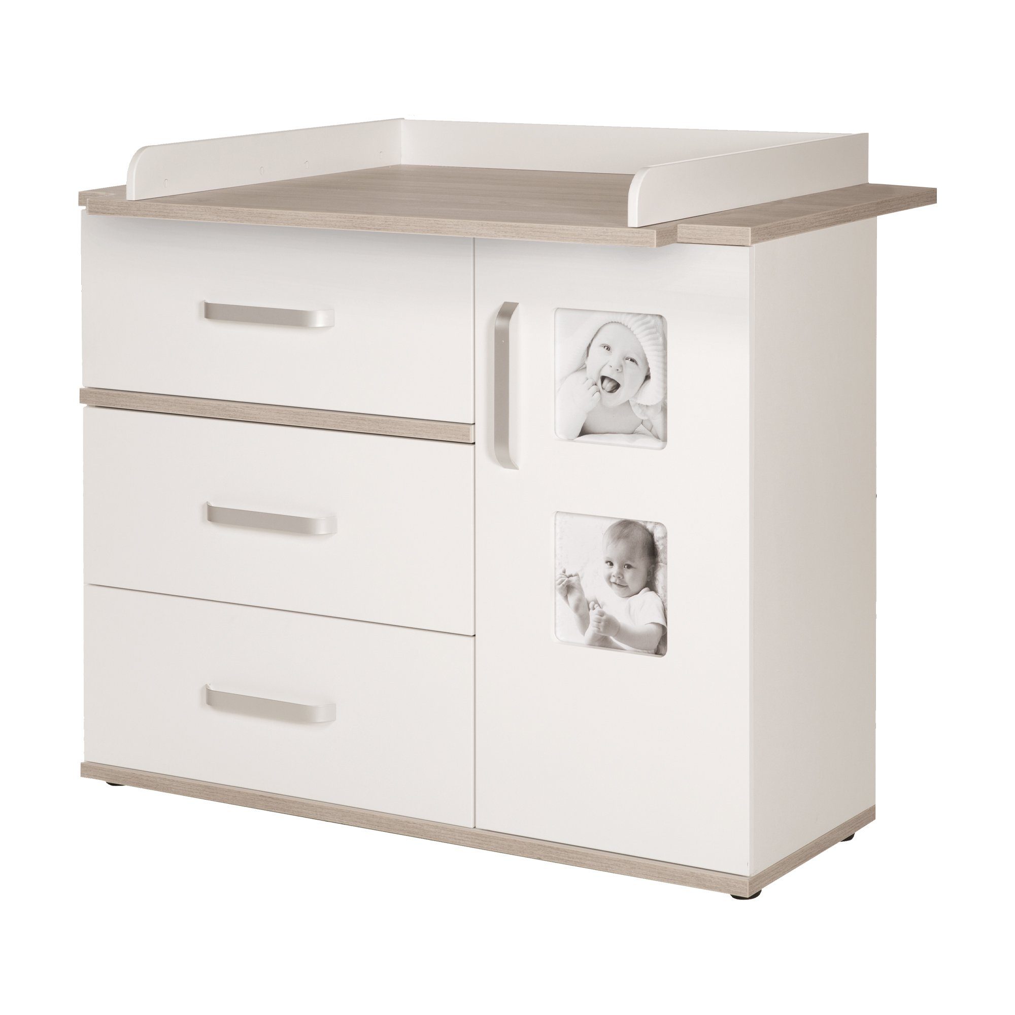 Die weiße roba Wickelkommode mit Dekorplatten in Luna Elm wird in der EU gefertigt. Die Besonderheit der Kommode 'Moritz' sind 2 Bilderrahmen in der Tür der Kommode