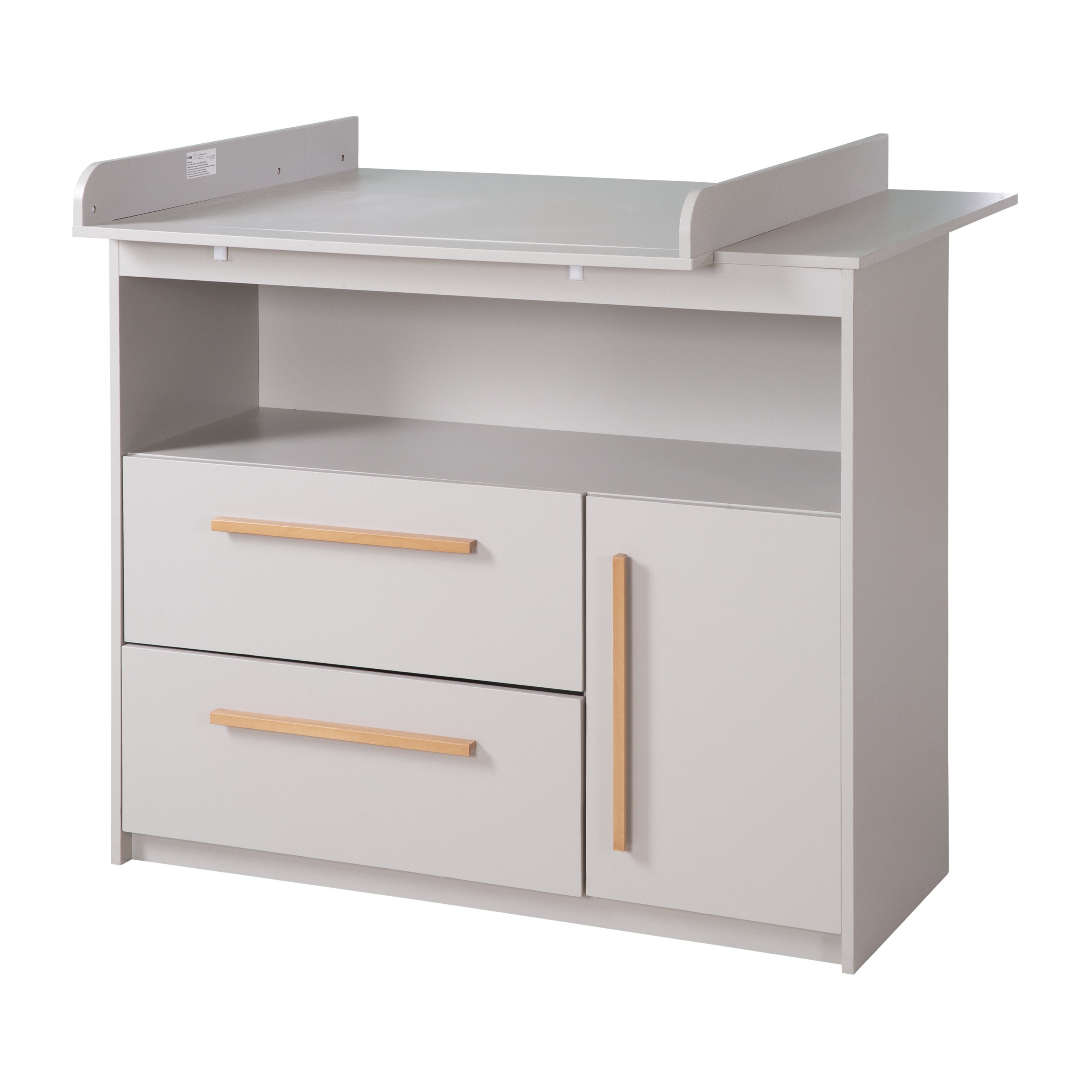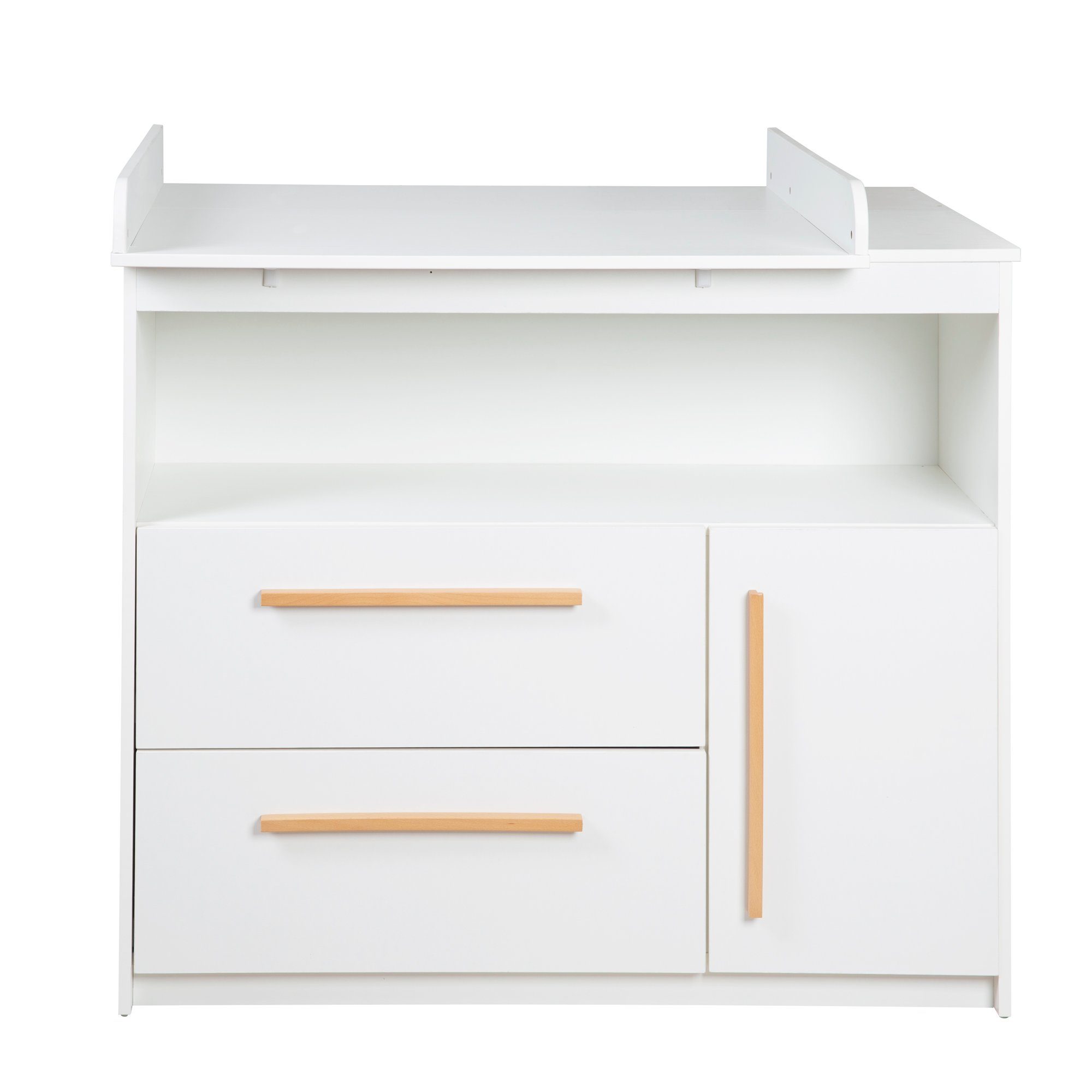 Die Wickelkommode bietet hinter der Tür sowie Schubladen viel Stauraum - Dank des offenen Faches sind Windeln, Handtücher und andere wichtige Pflegeutensilien stets griffbereit