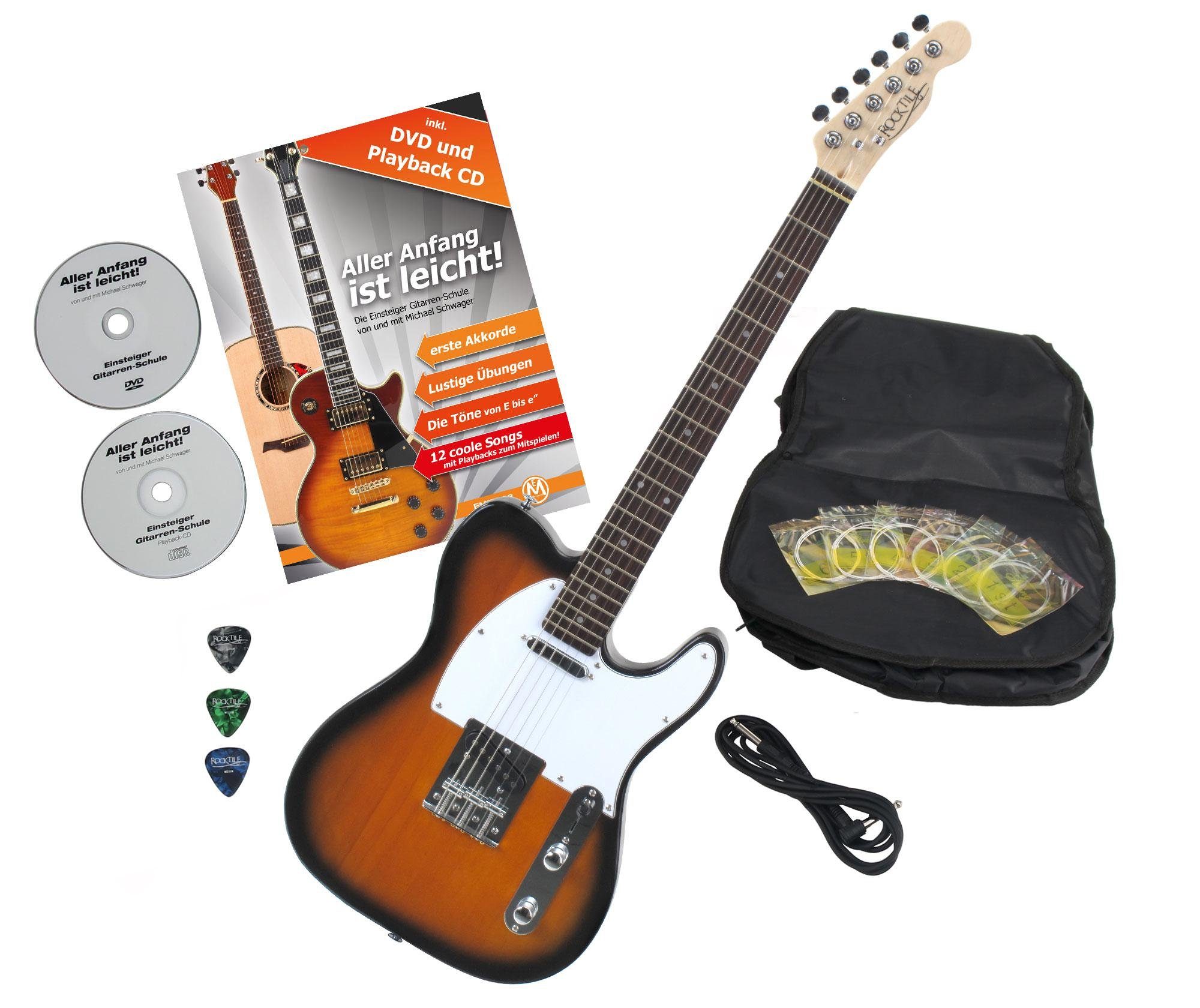 Lieferumfang | Sechskantschlüssel Gitarren Schule E-Gitarrentasche Kabel Plektren und Ersatzsaiten |