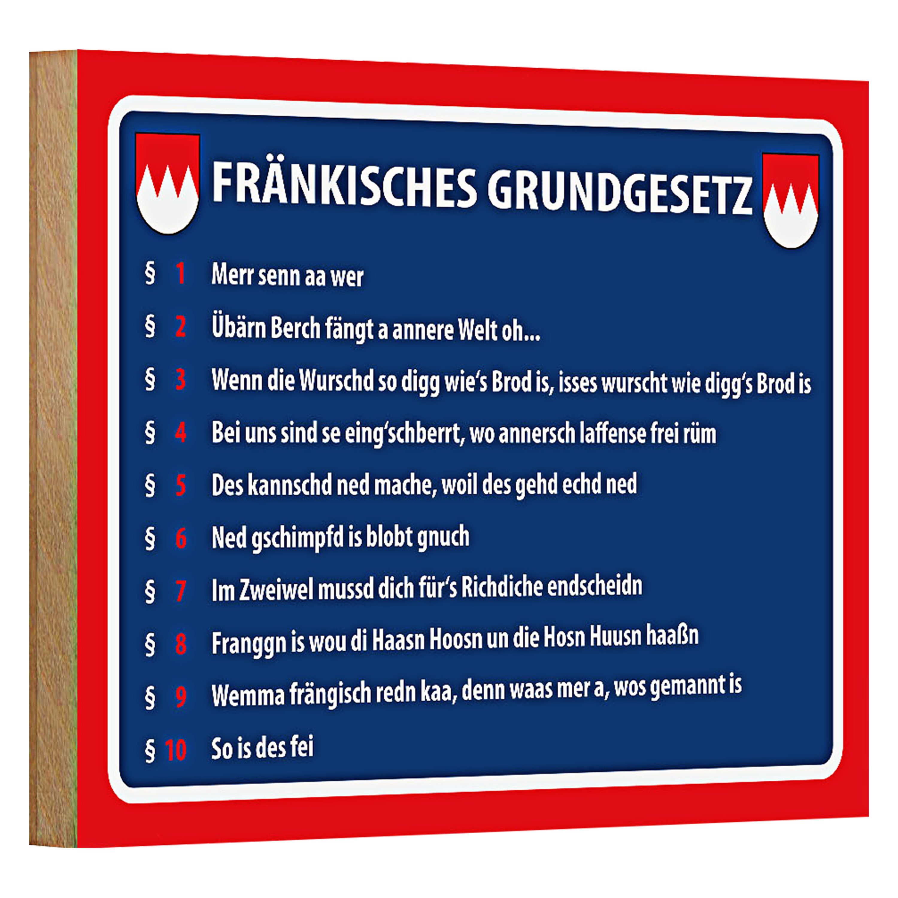 Dieses charmante Holzschild präsentiert das 'Fränkische Grundgesetz' in humorvoller Mundart.