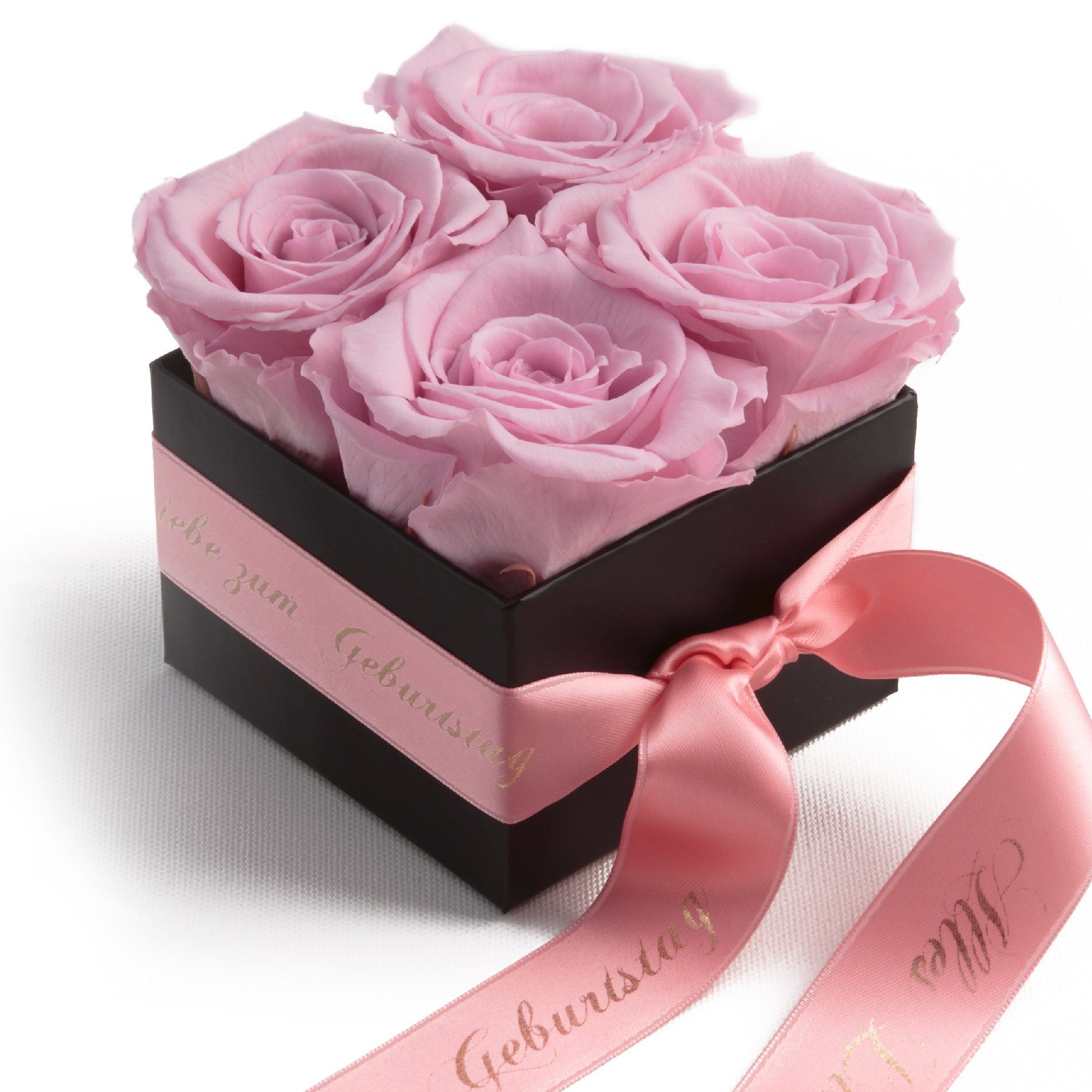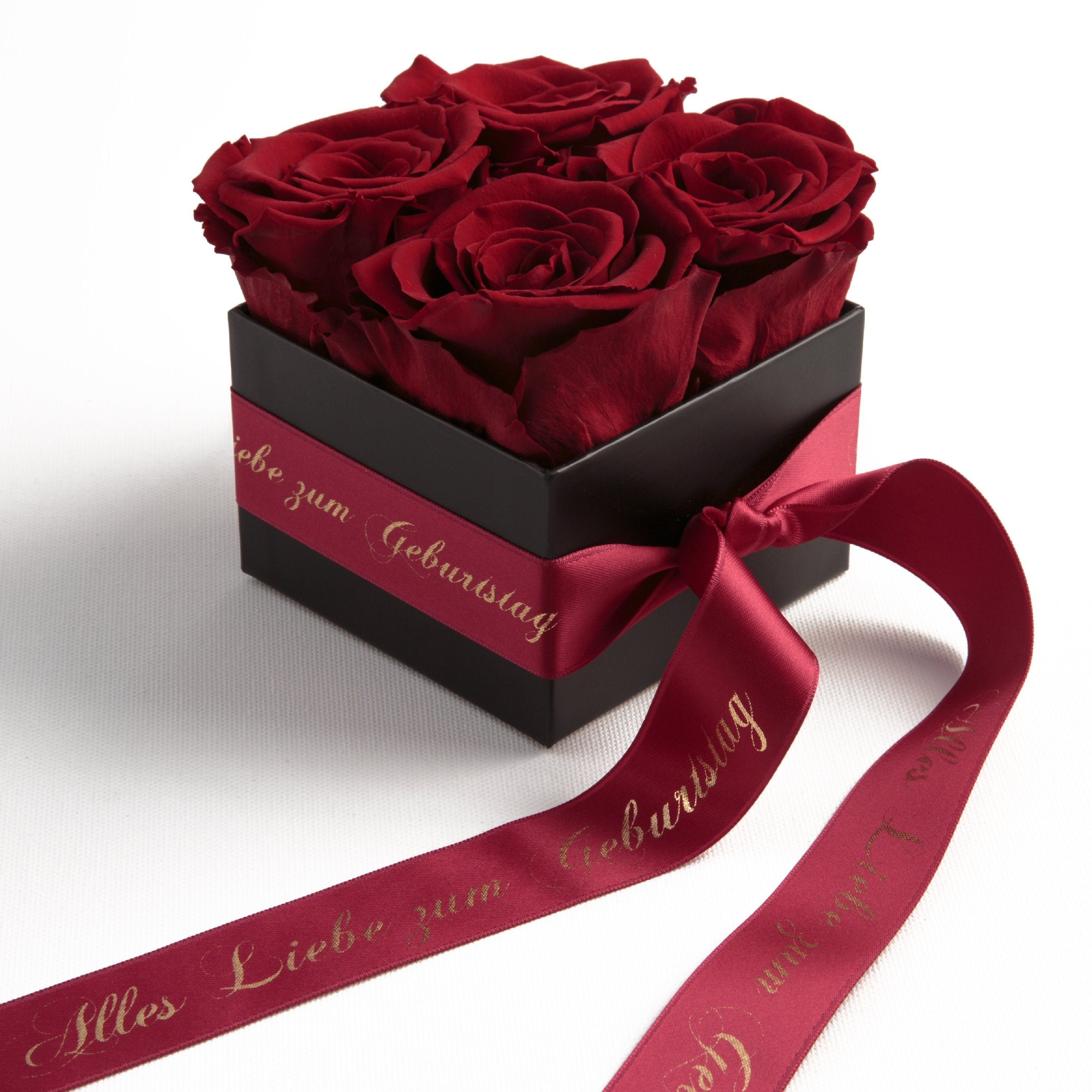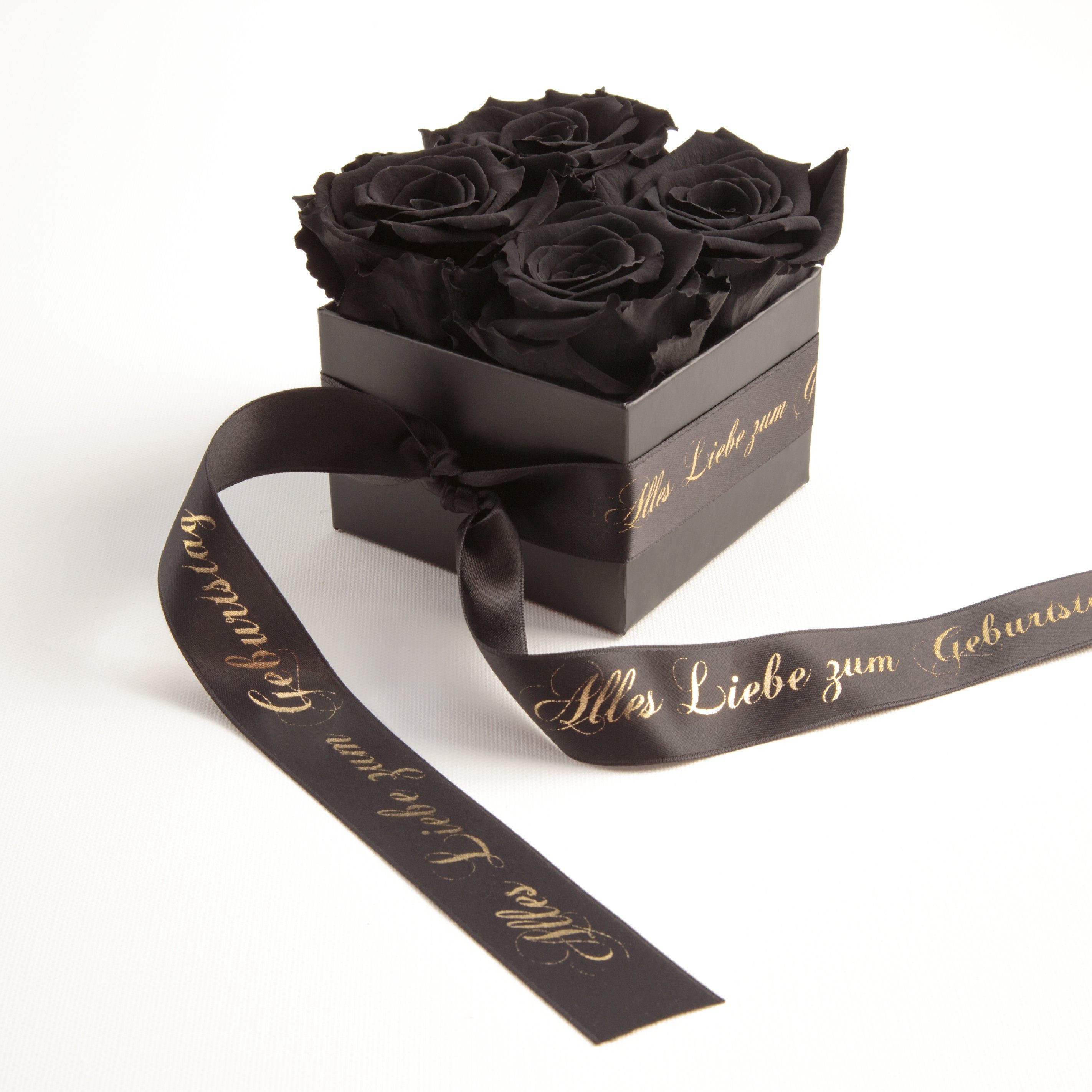 Hinweis Lieferumfang | Blumenbox schwarz 4 Infinity Rosen, Satinband bedruckt mit goldfarbene Widmung Всіs Liebe zum Geburtstag |