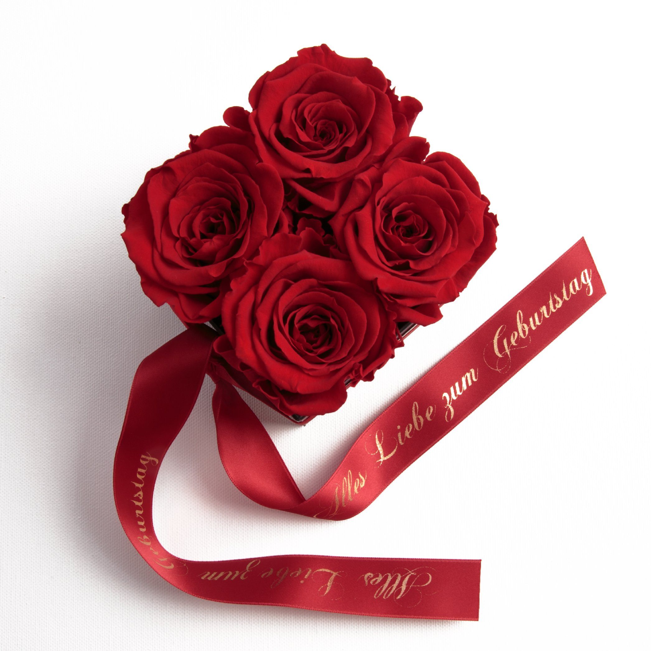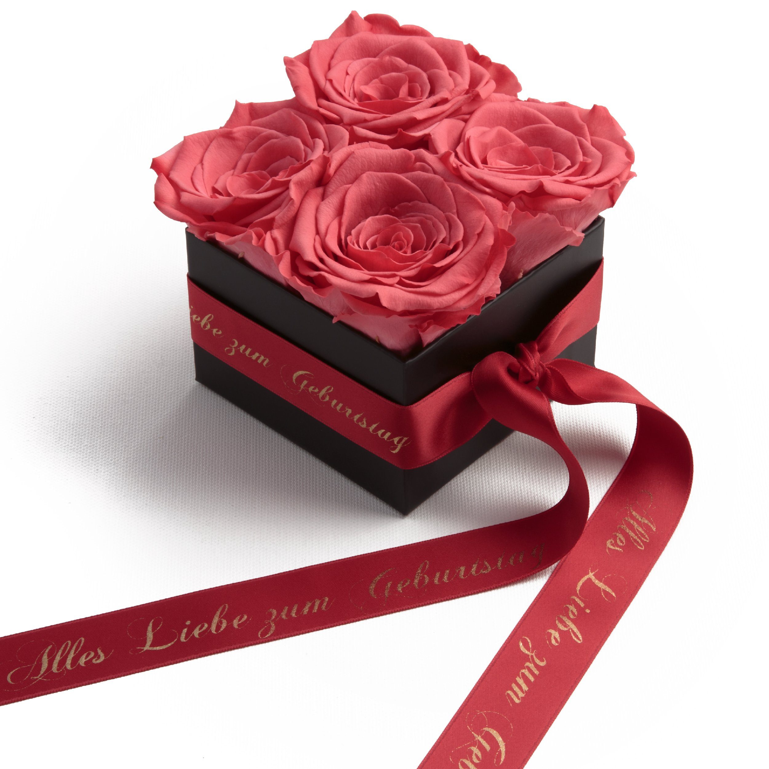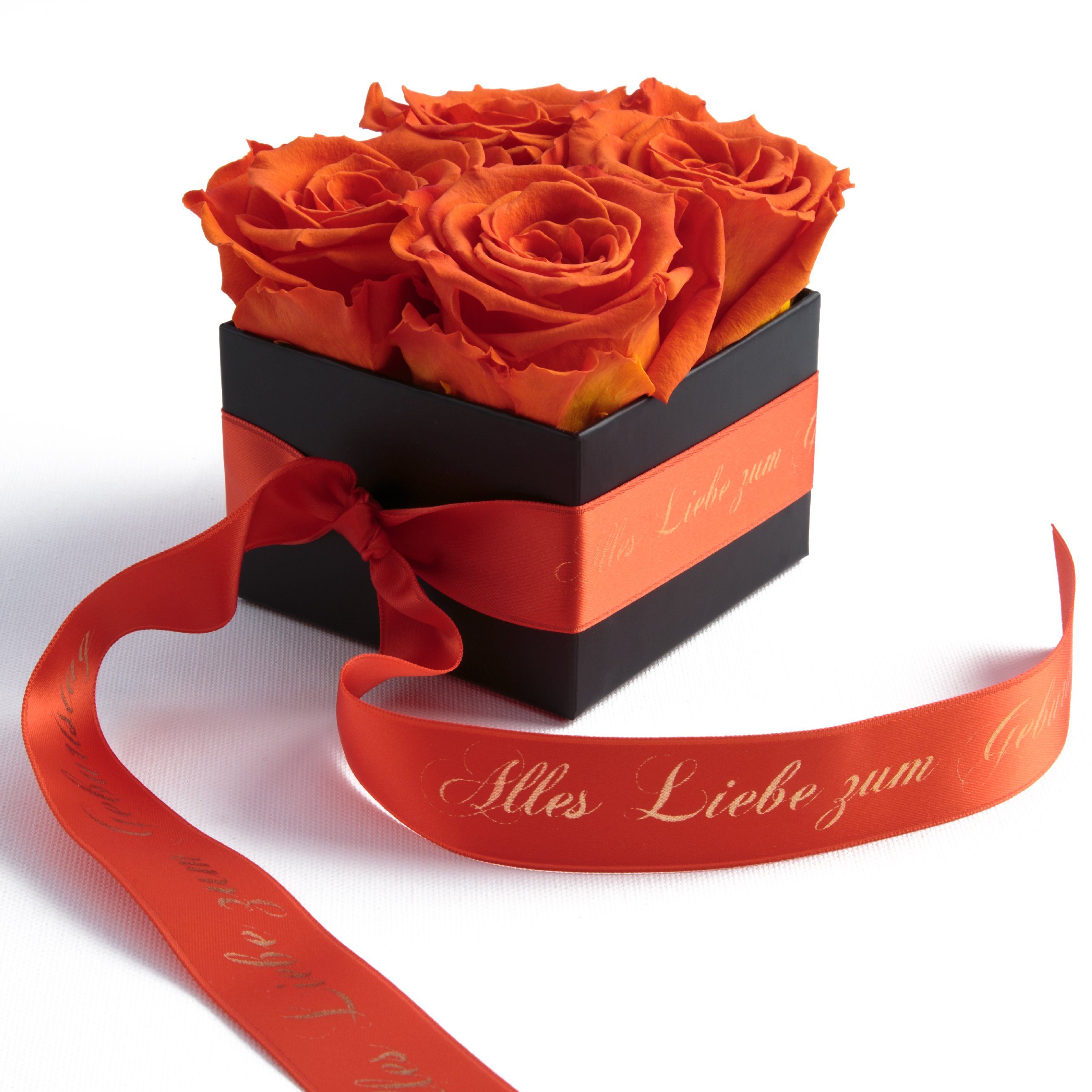 Hinweis Lieferumfang | Blumenbox schwarz 4 Infinity Rosen, Satinband bedruckt mit goldfarbene Widmung Всіs Liebe zum Geburtstag |