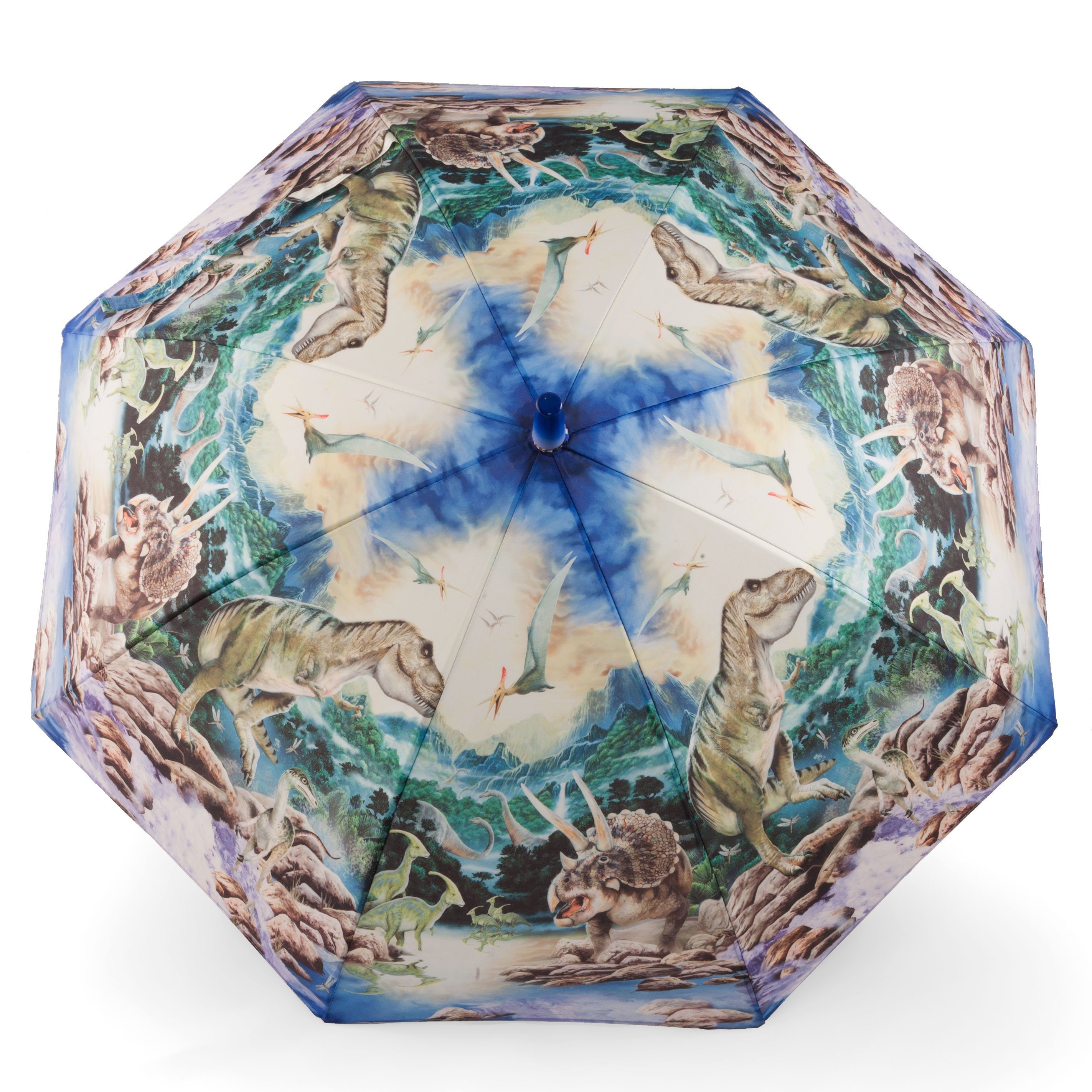 Dieser Kinderschirm mit Dinosaurier Fantasiemotiv, ist im geschlossenen Zustand ca. 65 cm lang. Sein Durchmesser beträgt ca. 80 cm.