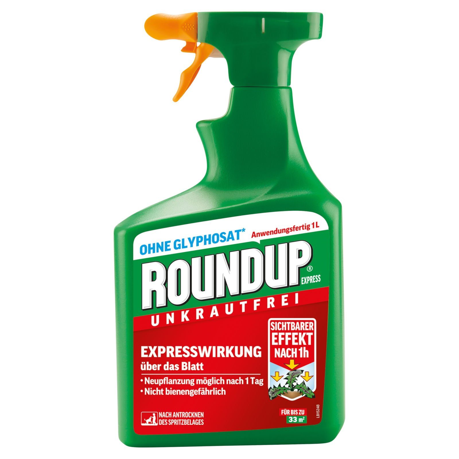 Roundup Unkrautfrei Express ist ein anwendungsfertiges Spray und bekämpft schnell und wirksam einjährige zweikeimblättrige Unkräuter und Ungräser in Beeten und auf unbefestigten Gartenwegen. Da es nur auf grüne, nicht verholzte Pflanzen und Pflanzenteile wirkt, können Unkräuter unter Bäumen und Sträuchern bekämpft werden. Je nach Witterung ist die Wirkung bereits innerhalb einer Stunde sichtbar. Auch alle grünen, oberirdischen Pflanzenteile von mehrjährigen Unkräutern werden geschädigt.