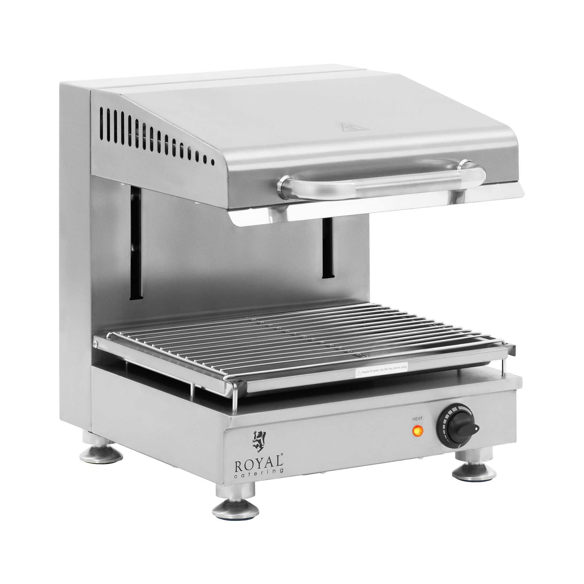Verzaubern Sie Ihre Gäste in Ihrem Restaurant oder bei einem Catering mit heißen Snacks aus dem Salamander-Grill von Royal Catering. Der elektrische Backgrill für die Gastronomie eignet sich dank seiner starken Oberhitze zum Gratinieren, Grillen, Karamellisieren und Warmhalten von Speisen. Das obere Heizelement heben und senken Sie stufenlos über den breiten Griff und schaffen so einen Heizbereich mit 8 bis 21 cm Höhe – ideal für die Zubereitung von Pita, Toasts und Baguettes und Gratins. Dank des lebensmittelechten Edelstahls garen Sie direkt auf dem beiliegenden Rost.