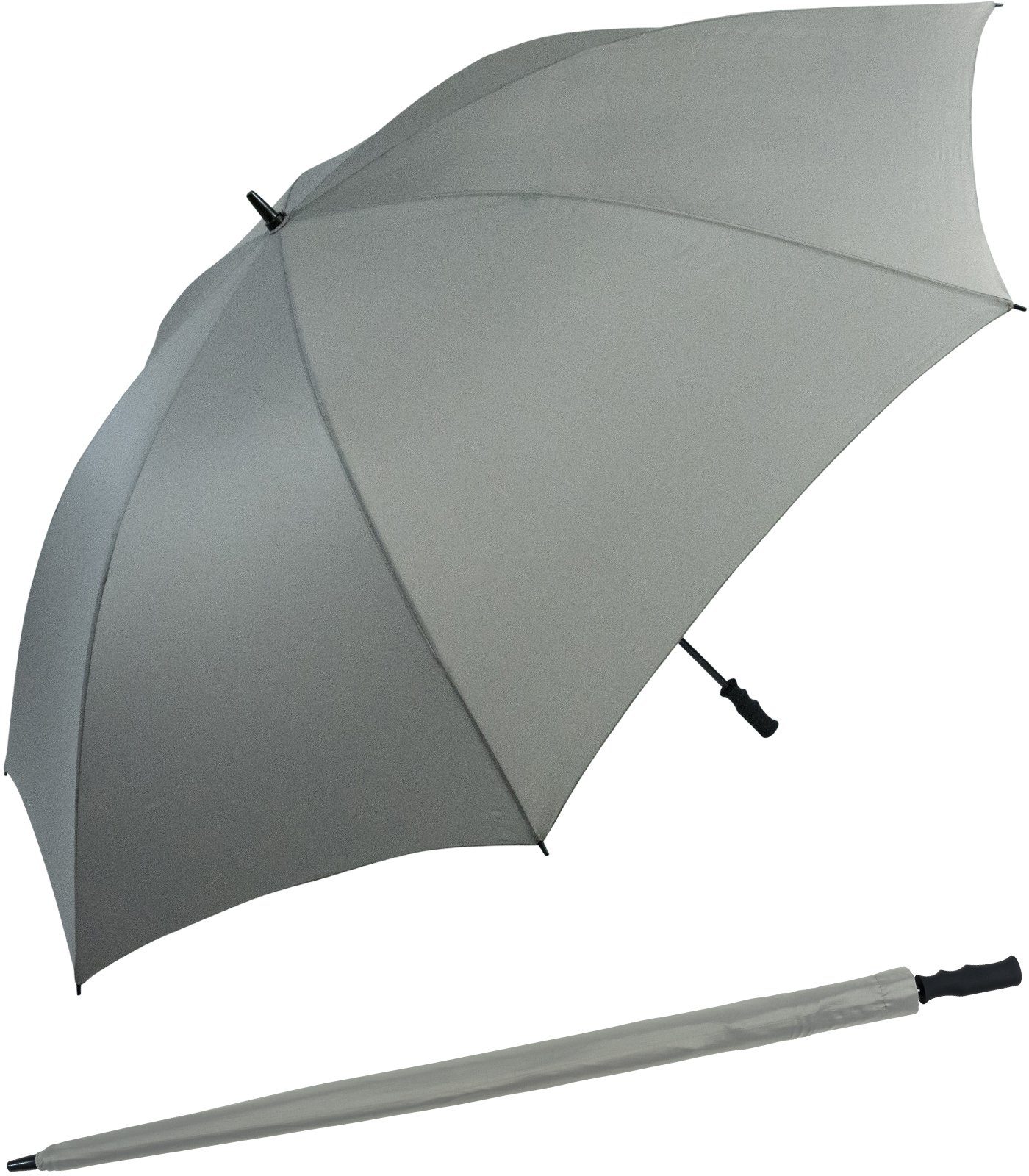Dieser ungewöhnlich große Golfschirm bietet sogar Familien Schutz vor Regen. Der unglaubliche Duchmesser von fast 1,80 m hält nicht nur Sie und ihren Partner trocken, sondern auch noch die Kinder. Der ergonomische Griff sorgt dabei für guten Halt. Die Farbe des Daches ist grau. Das verwendete Material besteht aus 100% Polyester. Riesengroß und stabil wiegt der Golfschirm nur ca. 890 Gramm. Geöffnet ist das Dach 178 cm groß. Geschlossen misst der Regenschirm 118 cm. Stock und Gestell dieses Familienschirms bestehen aus Fiberglas, so dass er trotz der gigantischen Розмір nicht allzu schwer ist. Geöffnet und geschlossen wird dieser Regenschirm manuell.
