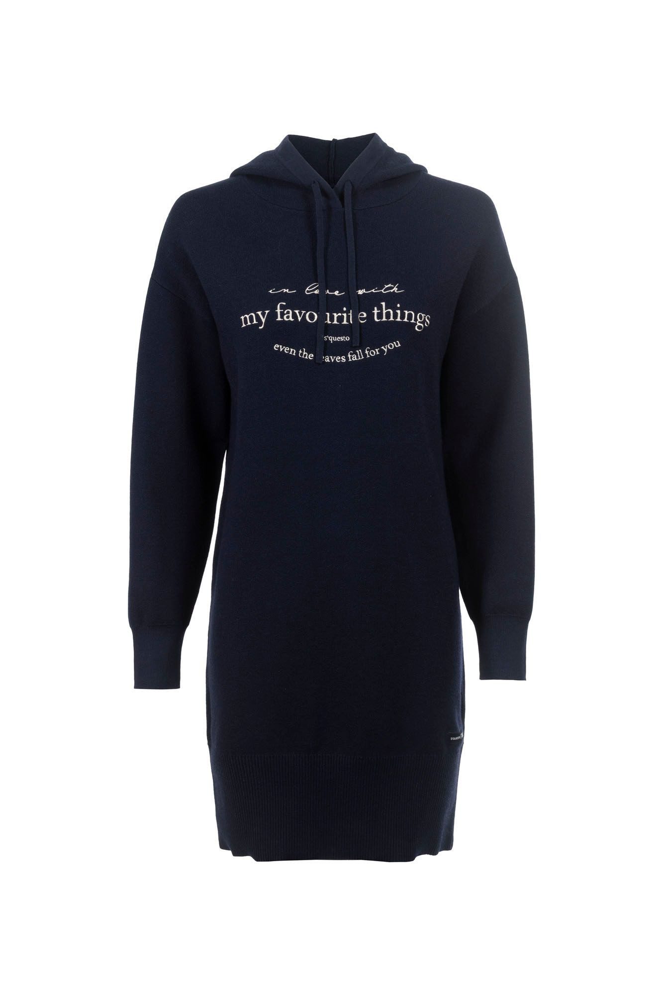 Das kurze Strickkleid von Soquesto kombiniert gemütlichen Tragekomfort mit einem modernen, urbanen Look. Die Kapuze mit Kordeln verleiht dem Design eine sportliche Note, während die feine Lettering-Stickerei auf der Brust für ein dezentes, stilvolles Detail sorgt. Überschnittene Schultern und gerippte Abschlüsse unterstreichen den lässigen Charakter dieses vielseitigen Allrounders – perfekt für entspannte Tage mit Stil.