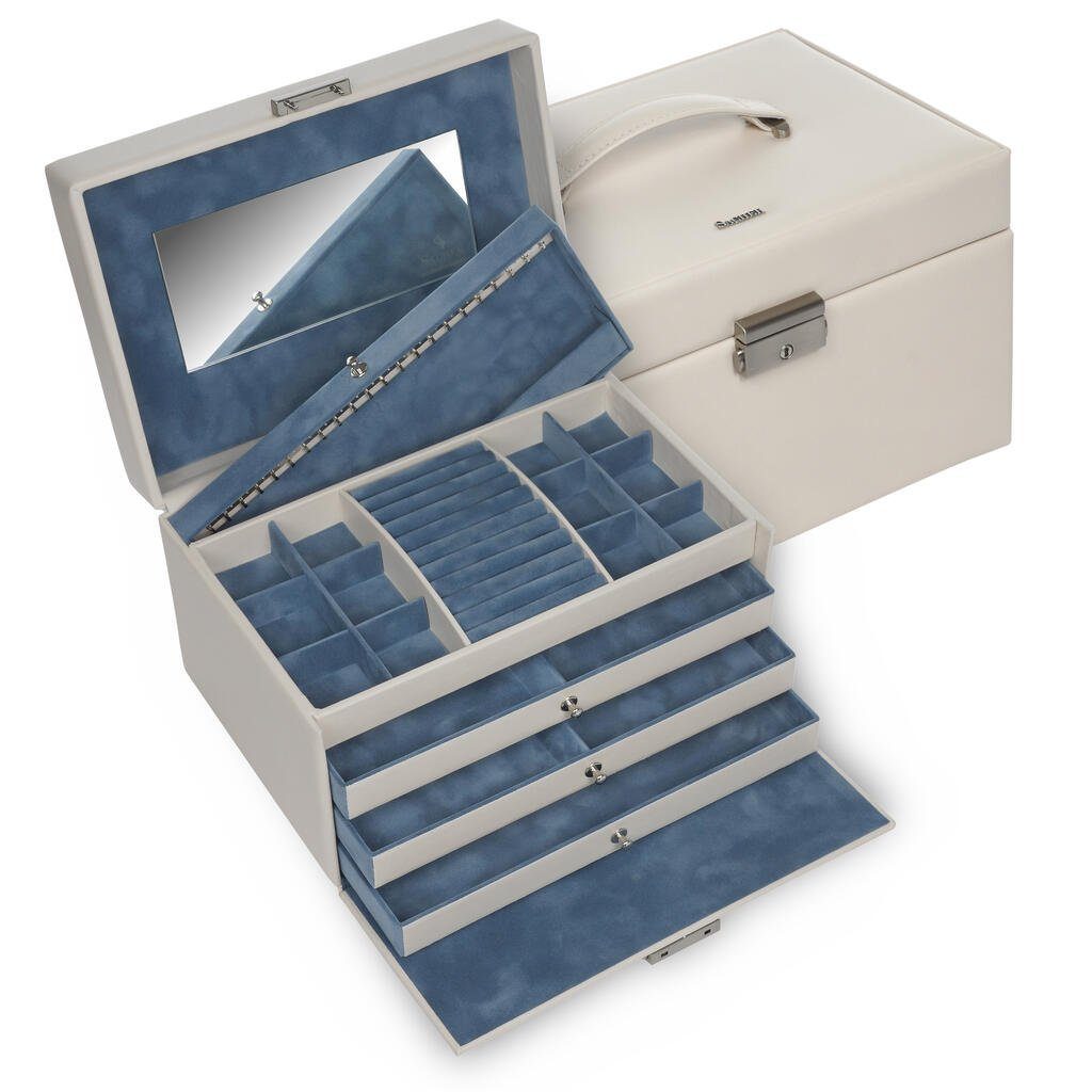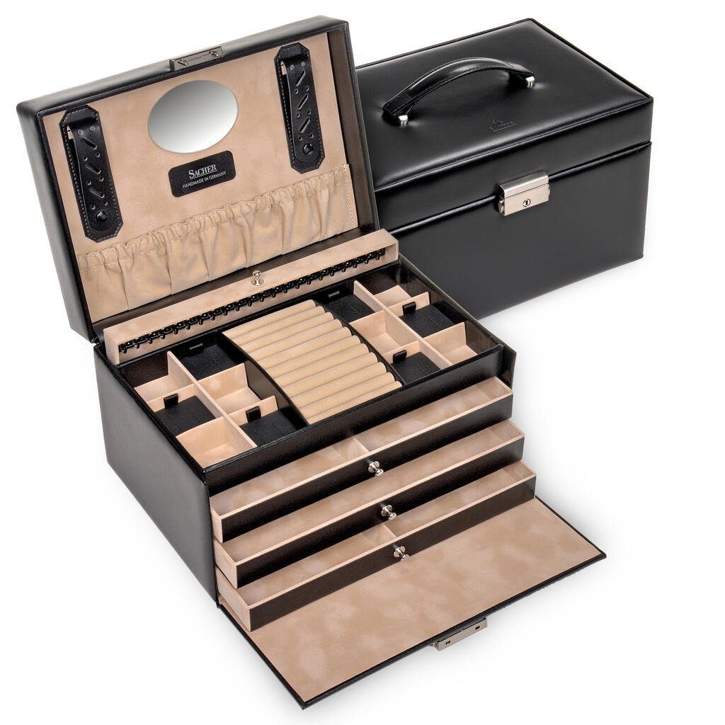 Markeninformationen | Die Schmuckkoffer-Manufaktur Sacher - ein Synonym für hochwertige Qualität! Seit ihrer Gründung im Jahre 1846 steht das inhabergeführte Unternehmen für traditionelle Handwerkskunst und moderne Застосуватиungstechniken. Die handgefertigten Schmuckkoffer, Uhrenetuis und Maniküren, die du erhältst, werden von erfahrenen Etuimachern hergestellt, die das handwerkliche Können auf höchstem Niveau beherrschen. Die Verwendung von nachhaltigen und wasserlöslichen Klebstoffen sowie die Produktion von Rohkörpern aus Kartonage mit FSC-Siegel unterstreichen das Engagement für Umweltschutz. Darüber hinaus werden ausschließlich edle italienische Leder verarbeitet, was die hochwertige Qualität der Schmuckkoffer, die du erhältst, unterstreicht. Entdecke die exklusive Welt der Schmuckkoffer-Manufaktur Sacher und erlebe den Unterschied hochwertiger Handwerkskunst. |