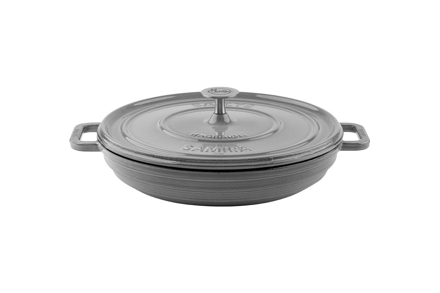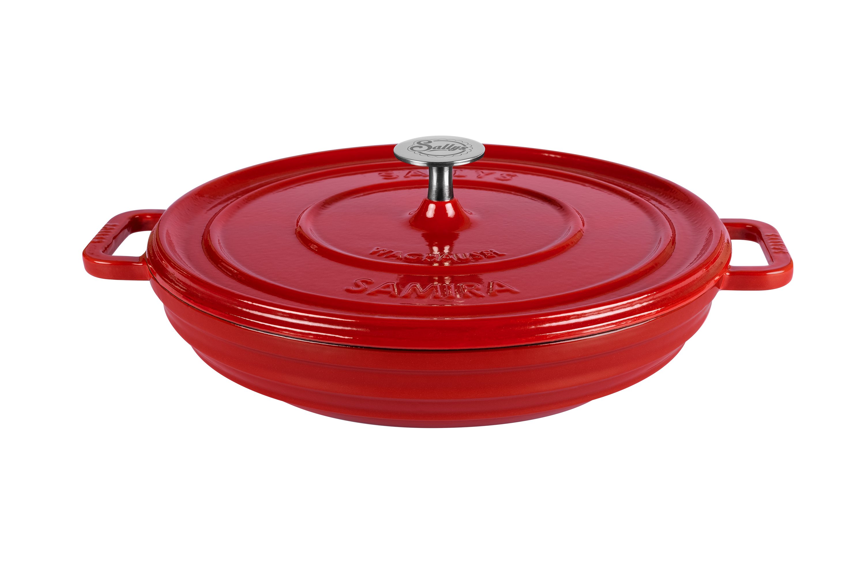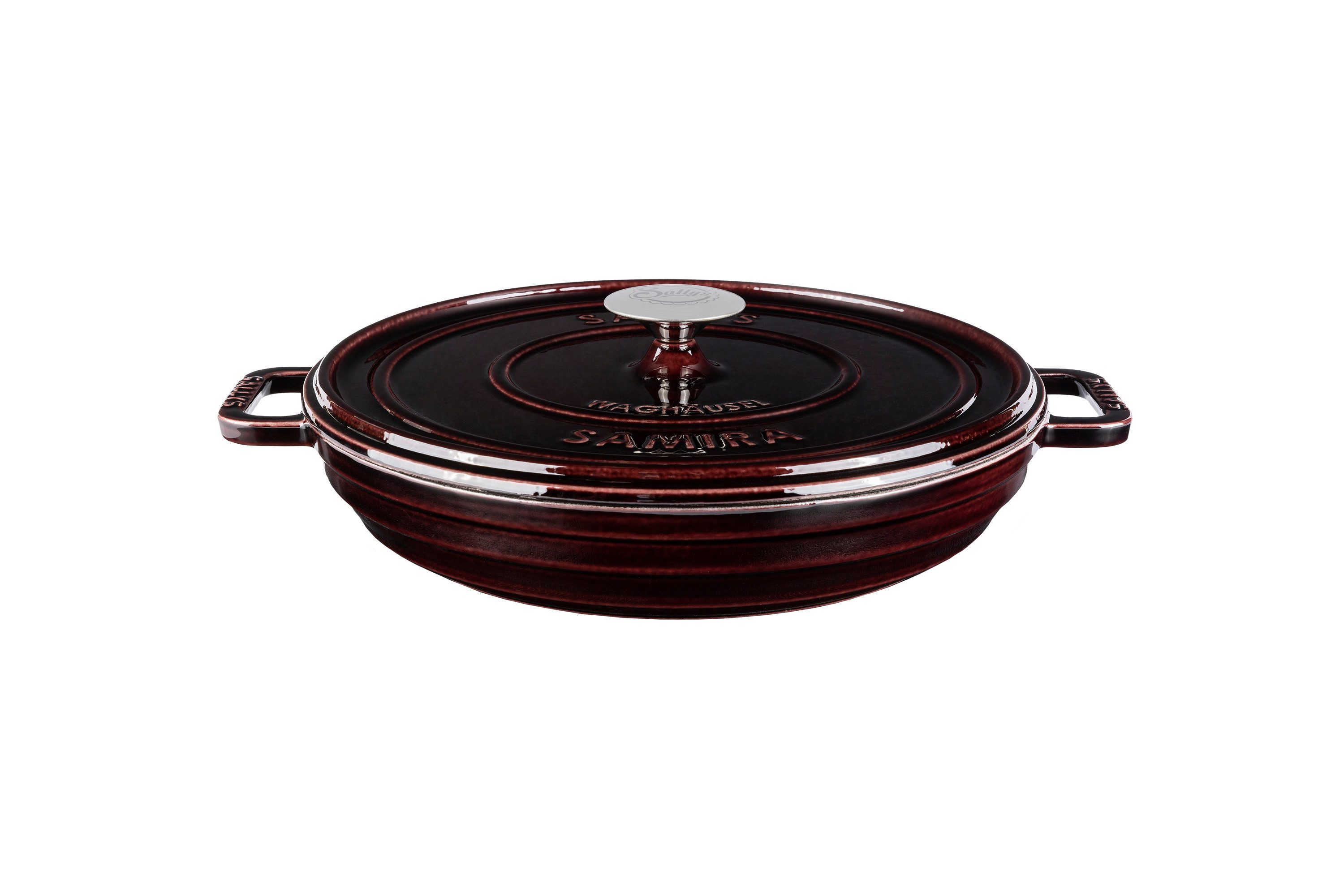 Größe: Ø außen (cm): 32 , Ø innen (cm): 31 Höhe innen (cm): 5,5, Höhe außen (cm): 6, Höhe mit Deckel (cm): 11, von Griff zu Griff (cm): 39