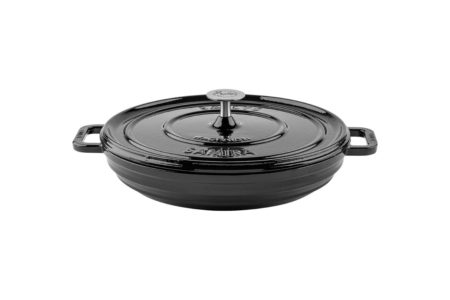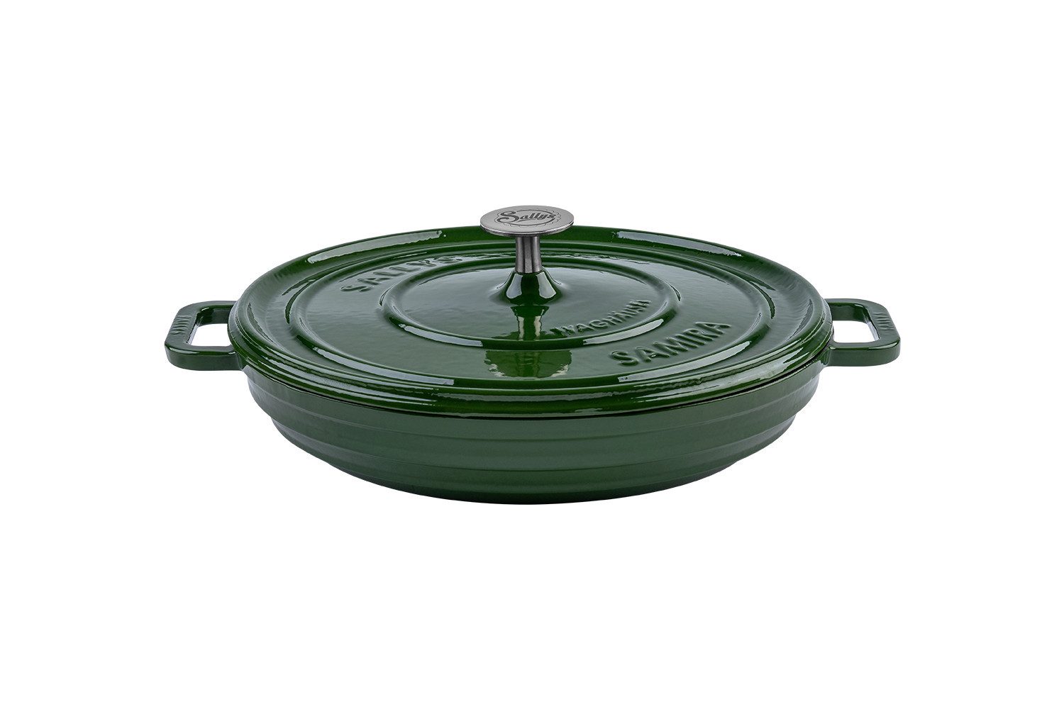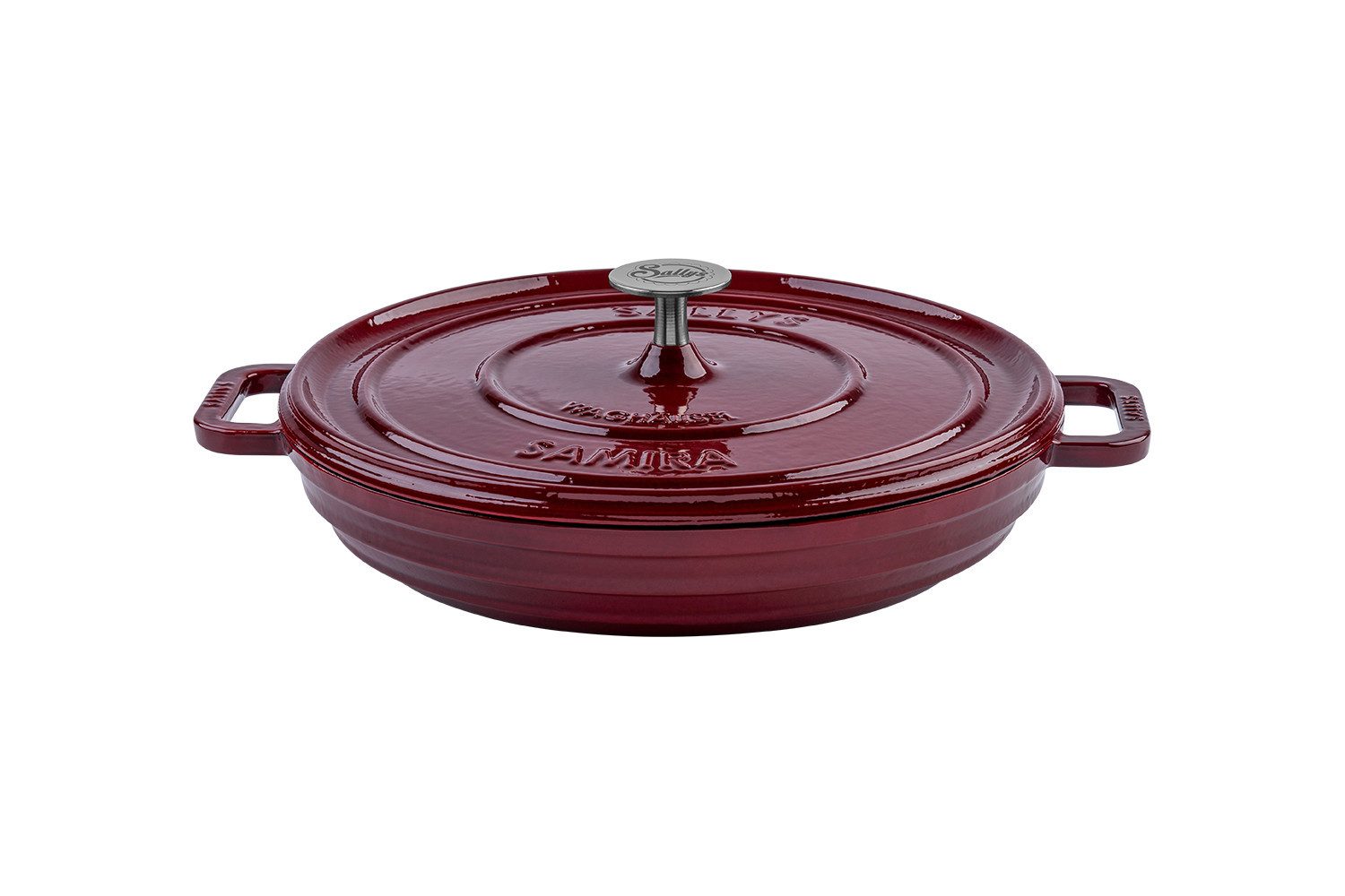 Größe: Ø außen (cm): 32 , Ø innen (cm): 31 Höhe innen (cm): 5,5, Höhe außen (cm): 6, Höhe mit Deckel (cm): 11, von Griff zu Griff (cm): 39