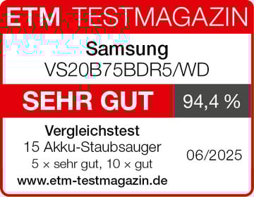 Der Samsung VS20B75BDR5/WD erzielt im Vergleichstest des „ETM TESTMAGAZINS“ mit 14 weiteren Akku-Staubsaugern das Gesamtergebnis „sehr gut (94,4 %)“. Die Saugleistung ist auf Hart- und Teppichböden sowie auf Mobiliar sehr hoch und das Volumen ist sehr groß. Die Arbeitszeit ist lang, die Ladezeit ist sehr kurz und der Schallausstoß ist sehr gering. Das Gerät bietet viele Funktionen und ist hervorragend verarbeitet. Außerdem ist es sehr flexibel und sehr einfach zu bedienen sowie zu reinigen. Insgesamt erreicht das Modell das zweitbeste Ergebnis des Testspektrums.
