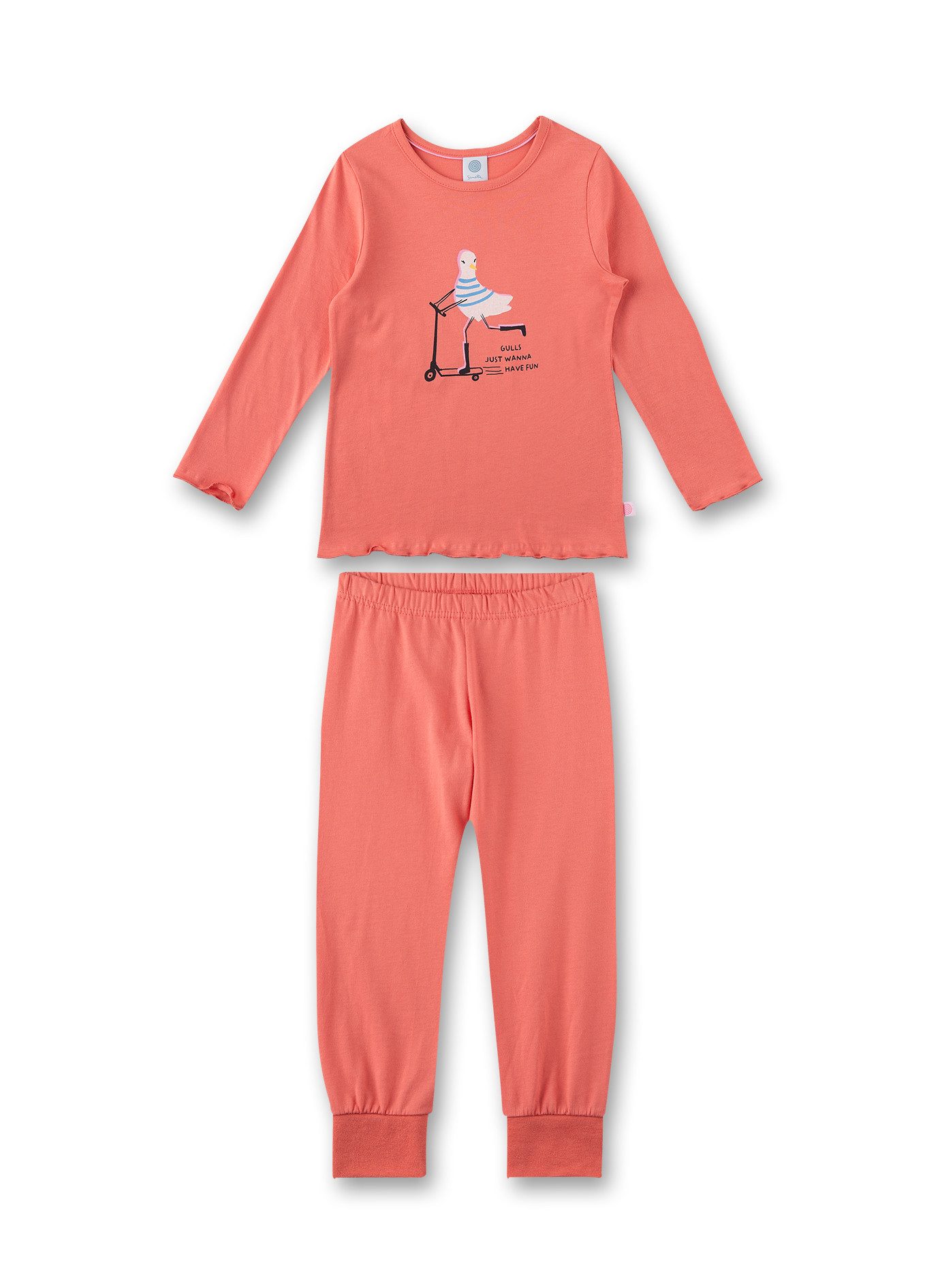 Fröhlicher Mädchen-Schlafanzug von Sanetta in einem erfrischenden Melonen-Rot mit einem lustigen Möwen-Motiv. - nachhaltig hergestellt aus bequemer Single-Jersey-Qualität aus 100% GOTS-zertifiziertet Bio-Baumwolle - ideal geeignet für die Übergangszeit oder kühle Sommernächte - schöne Farbigkeit trifft auf originelles Möwen-Artwork - Oberteil mit süßem Rollsaum am Bauch und den Ärmeln als mädchenhaftes Highlight - bequeme Schlafhose mit elastischem Taillenbund und bequemen Bündchen an den Beinen für eine perfekte Passform - pflegeleicht und trocknerbeständig