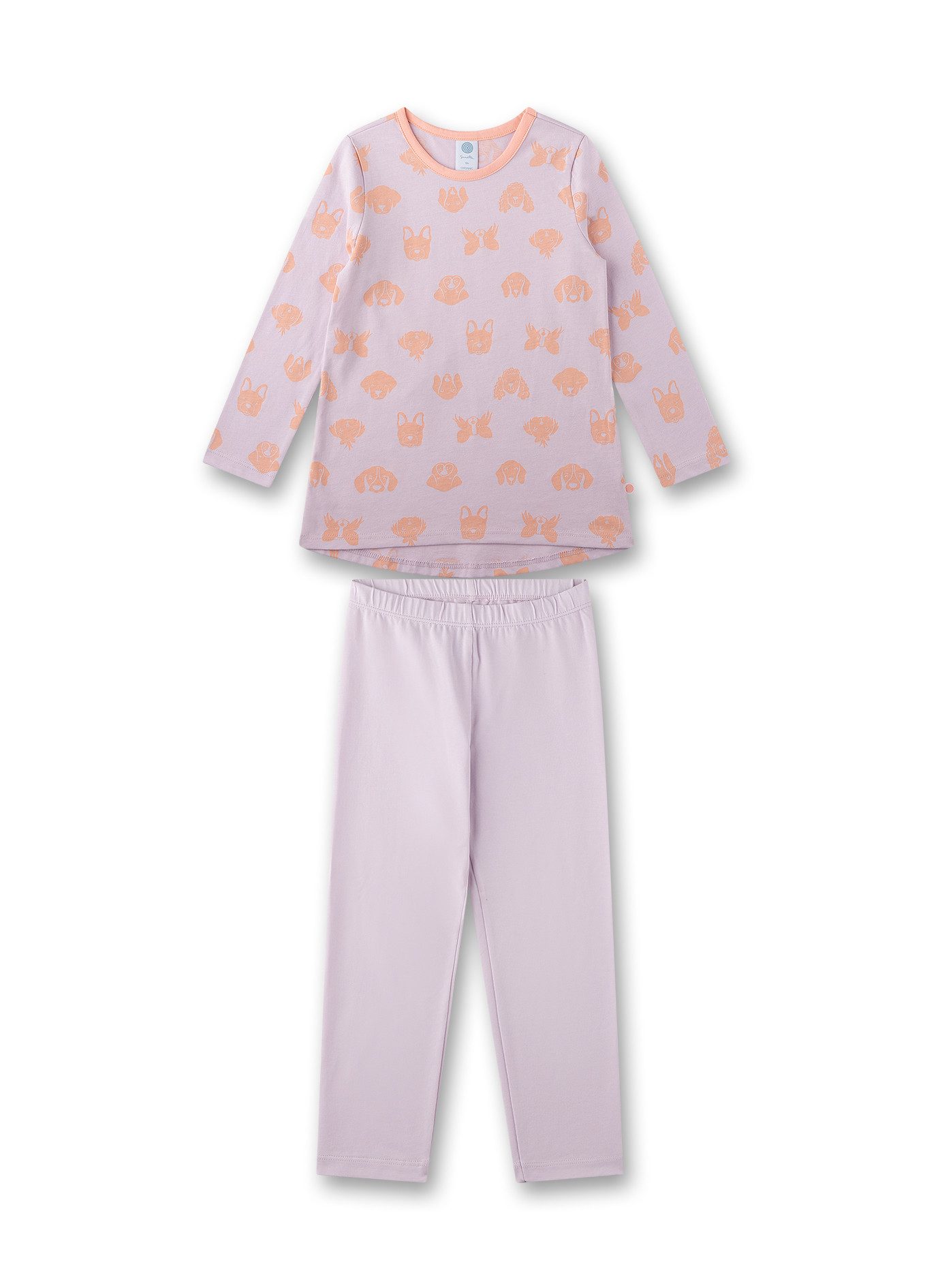 Fliederfarbener Mädchen-Schlafanzug mit verschiedenen Hunde-Motiven als Alloverprint auf dem Langarmshirt und einer bequemen Leggings. - Langarmshirt in einer Single-Jersey Qualität aus 100% GOTS zertifizierter Bio-Baumwolle für einen unbeschwerten Tragekomfort - bequeme Leggings mit elastischen und anschmiegsamen Eigenschaften für eine optimale Passform - Langarmshirt mit leicht verlängertem Rückenteil - pflegeleicht und trocknerbeständig