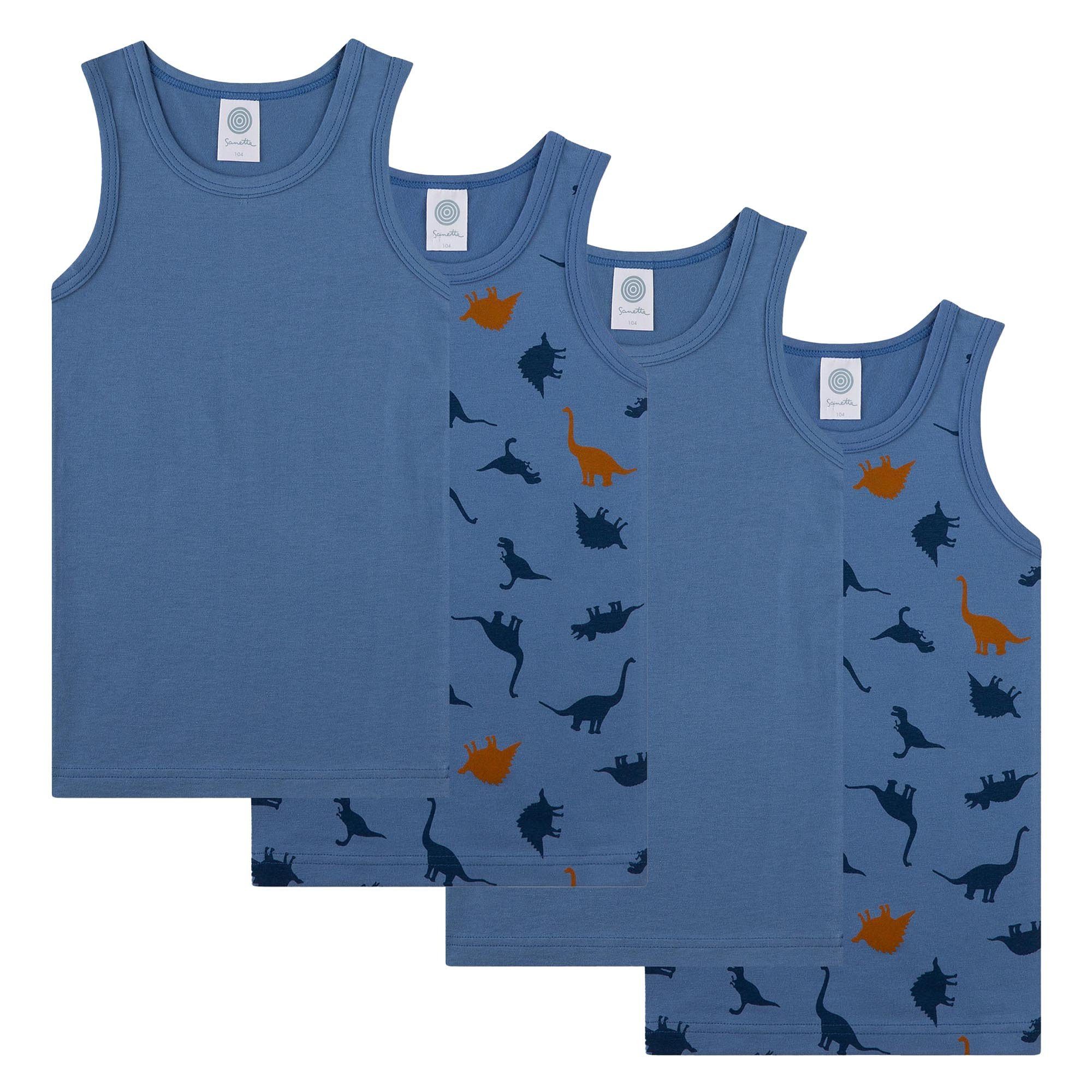 Vier Tops für Jungen von der Marke Sanetta. 2x einfarbig und 2x mit Dino-Alloverprint. Weicher Jersey aus elastischer Baumwoll-Qualität.
