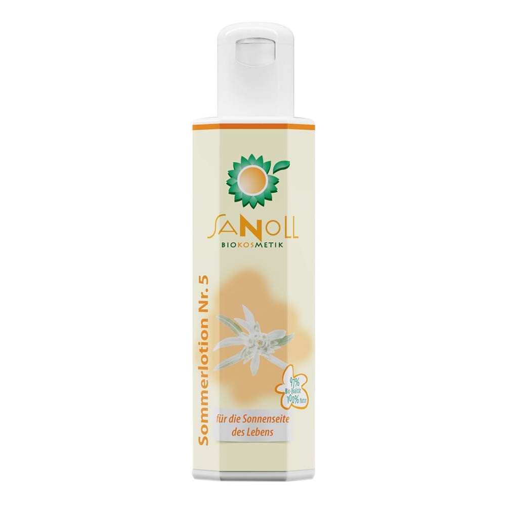Hinweis: Bei der SANOLL Sommerlotion Nr. 5 handelt es sich um keinen Sonnenschutz in klassischem oder gesetzlichem Sinne. Wir bieten eine Sommerlotion zur Hautpflege an, welche die Haut in ihren eigenen Regulationsmechanismen unterstützen kann.