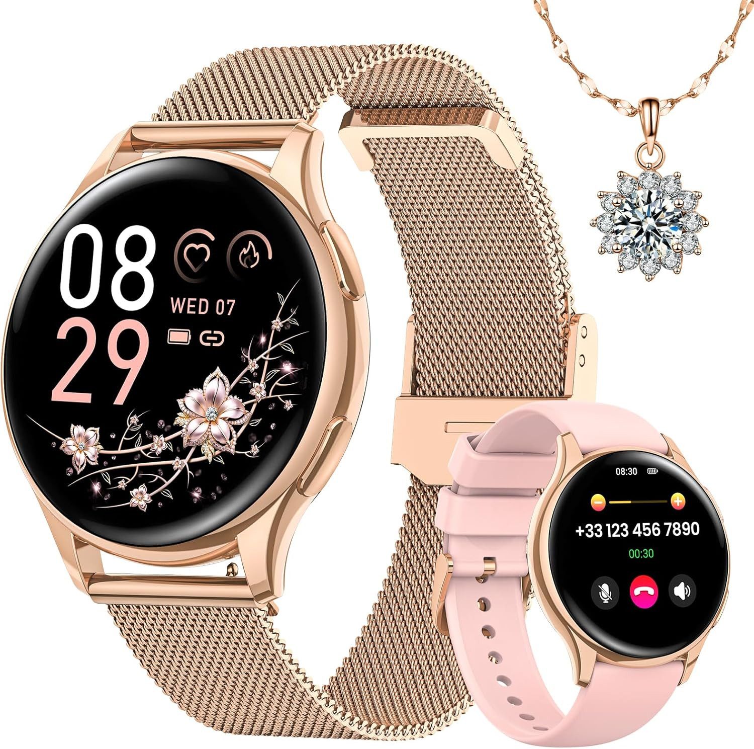 Smartwatch Damen, 1.27" HD Voll Touchscreen Armbanduhr mit Telefonfunktion Menstruationszyklus SpO2 Pulsuhr Schrittzähler Kalorien Fitness Tracker IP68 iOS Android, Halskette Damen