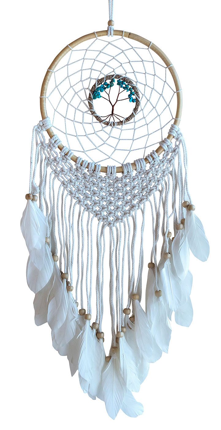 Traumfänger "Lebensbaum Zentrum" mit Lebensbaum aus Kupferdraht und Türkis Steinen, gehäkeltem Netz und weißen Federn, 70x22