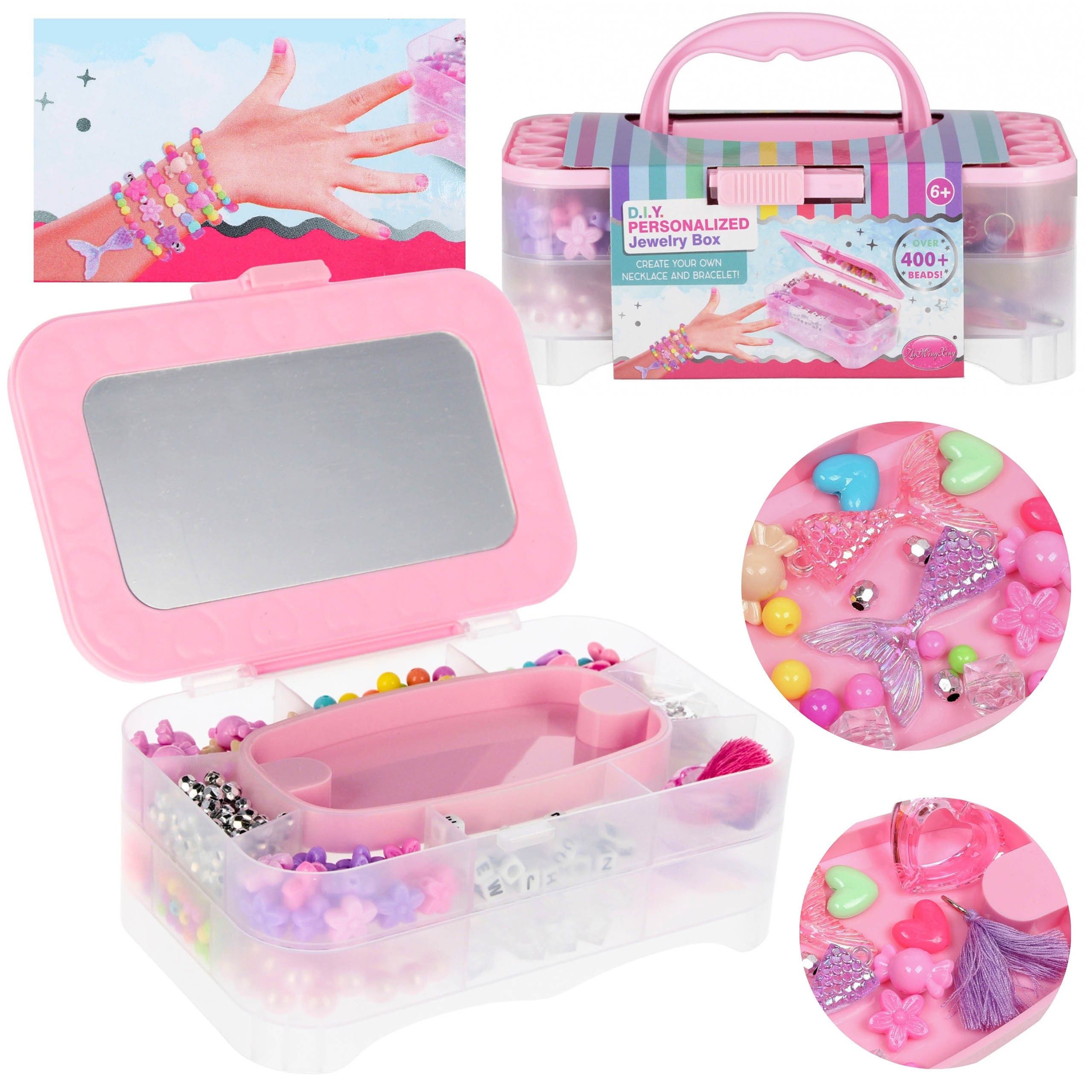 Das Set enthält über 400 verschiedenfarbige Perlen und Zubehörteile, mit denen sich einzigartige Armbänder, Halsketten und andere Verzierungen herstellen lassen.