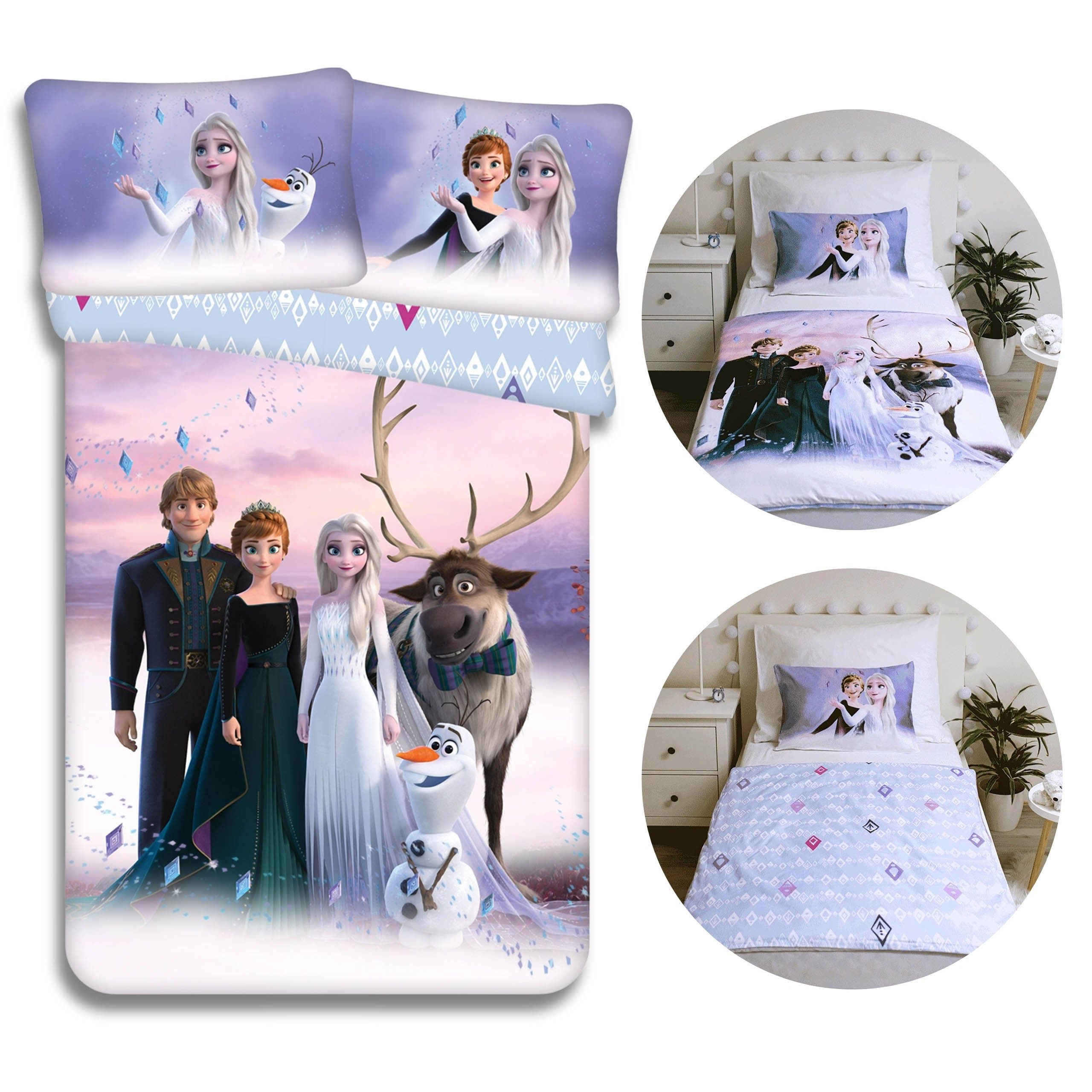 Die Kinderbettwäsche mit Figuren aus dem Film "Die Eiskönigin 2" bringt eine magische Atmosphäre in jedes Schlafzimmer.
