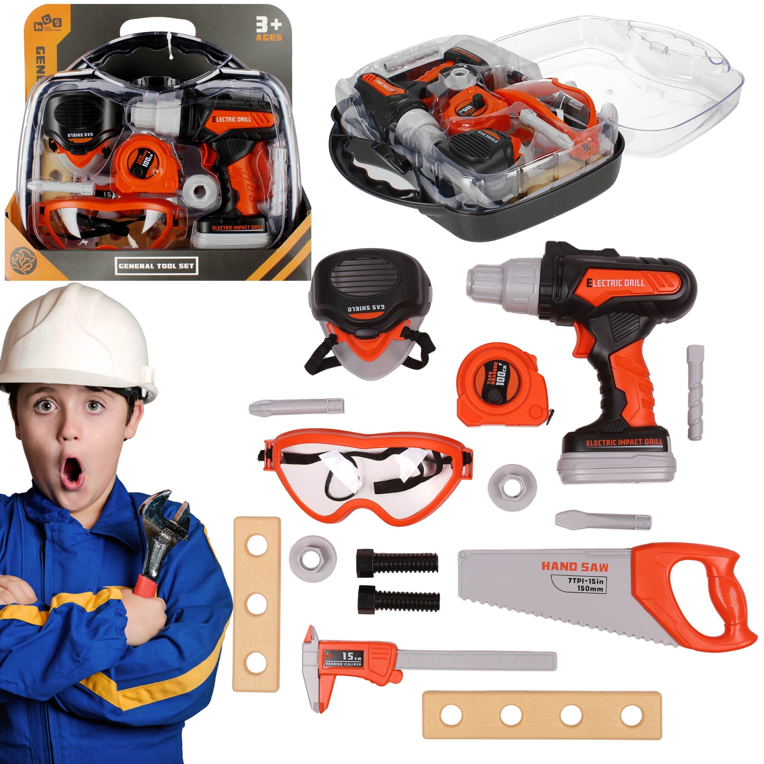 Der elegante transparente Koffer enthält eine Vielzahl von Werkzeugen wie eine elektrische Bohrmaschine + 3x Bohrer, Messgerät, Schutzbrille, Schutzmaske, Handsäge, Maßband, 2x Schraube + 2x Schraubenmutter, 1x kleines Brett, 1x großes Brett, Zubehör, das zum Reparieren und Basteln notwendig ist.
