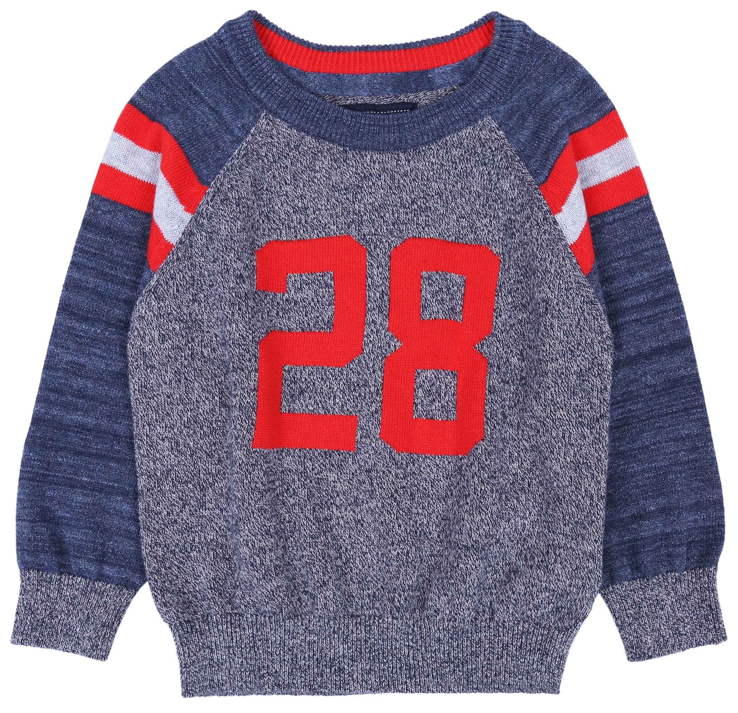 Grau-blau-roter Pullover über den Kopf angezogen, vorne mit Aufdruck der Zahl 28.