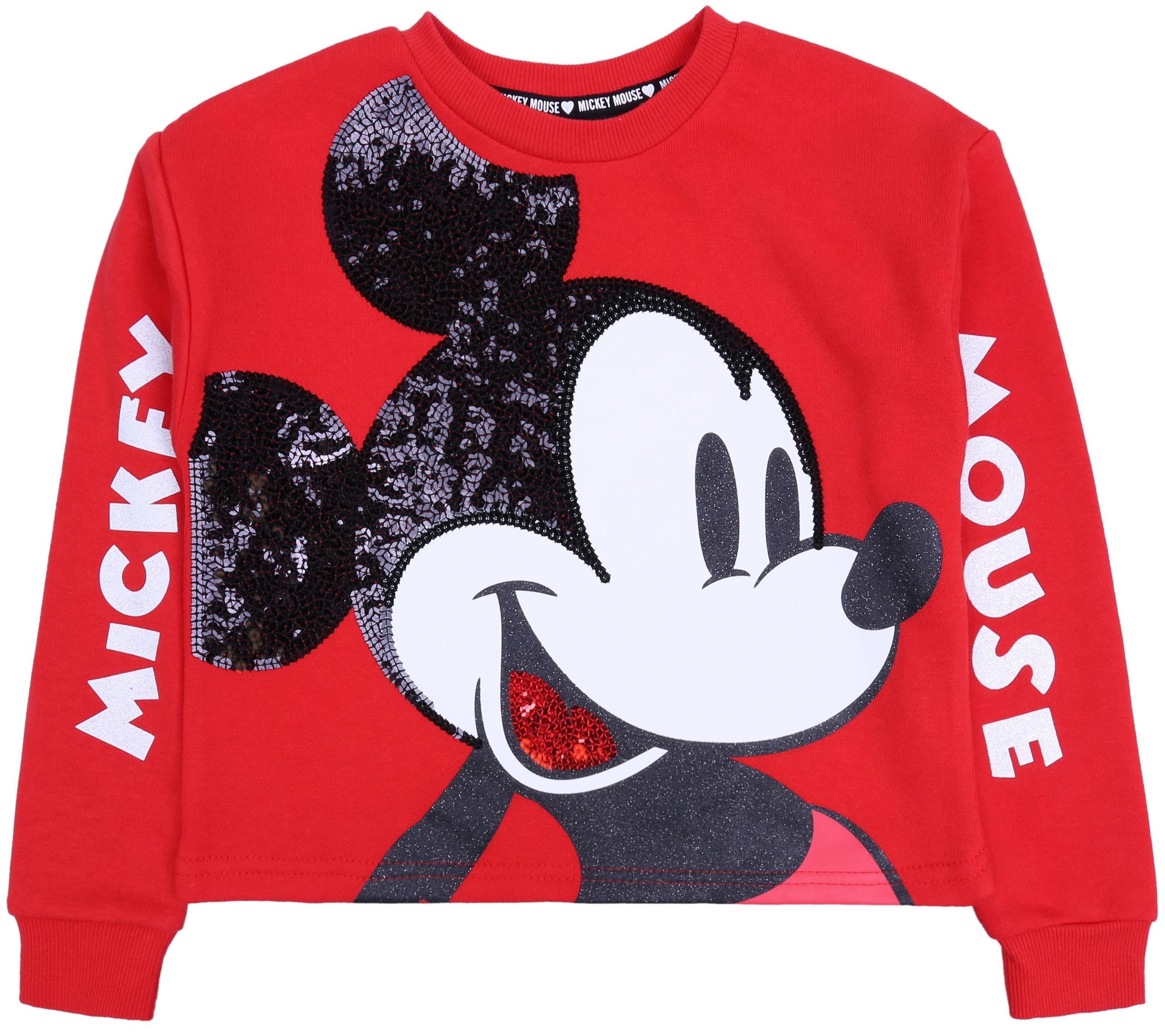 Vorne gibt es Abbildung von Mickey Mouse mit schimmernden Elementen aus Pailletten.