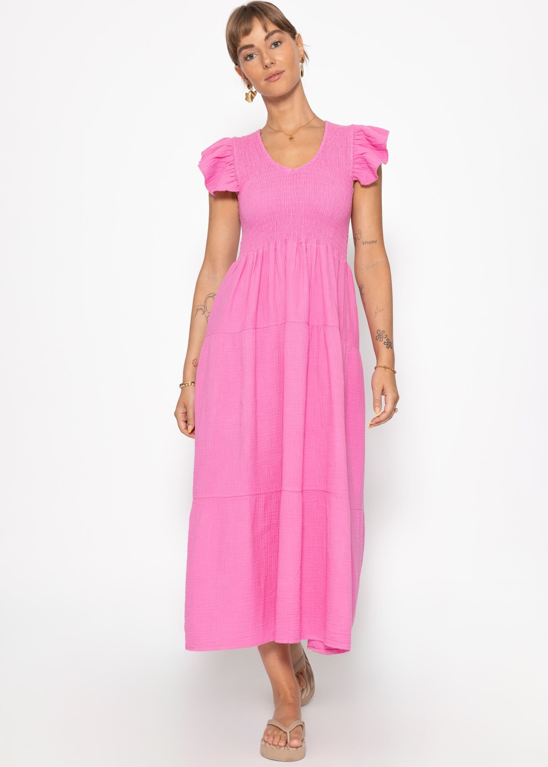 Besondere Merkmale | Sommerliches Kleid aus Musselin mit Flügelärmel Gelb Schwarz Pink |
