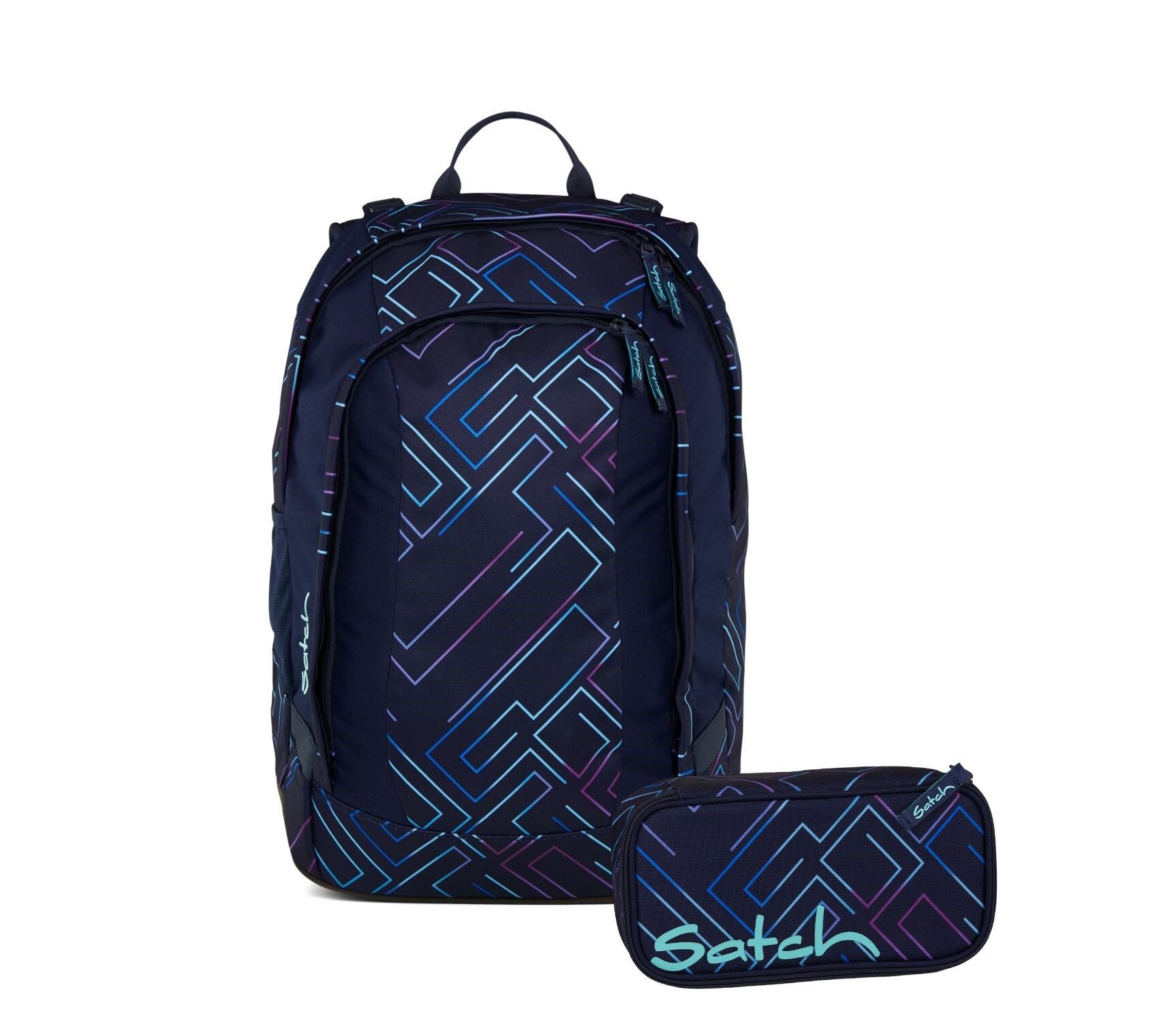 AIR - das Leichtgewicht von Satch ist nicht nur ultraleicht und ergonomisch, sondern besitzt auch eine sehr schmale Passform. Aufgeteilt ist der Schulrucksack in ein Hauptfach, ein Organizer-Fach mit Laptop-Fach und eine Seitentasche. Dank des Your-Size-System lässt sich der Rucksack an alle Größen zwischen 1,40 - 1,80 m anpassen und wächst somit stetig mit. Durch den höhen- und längenverstellbaren Brustgurt werden die Schultergelenke entlastet und der Schulranzen hat einen stabilen Sitz am Rücken. Der breite Hüftgurt ist ebenfalls in der Довжина verstellbar und verlagert das Gewicht gleichmäßig auf dem stabilen Becken des Kindes. Die Schultergurte und das Rückenteil sind gepolstert sowie atmungsaktiv. Für noch mehr Sichtbarkeit und Sicherheit sorgen die Reflektoren, welche sich rundherum am Schulrucksack befinden. Ein robuster und standfester Boden sorgt dafür, dass der Ranzen auch den Belastungen des Schulalltags standhält. Aus 14 PET-Flaschen (0,5 l) hergestellt.