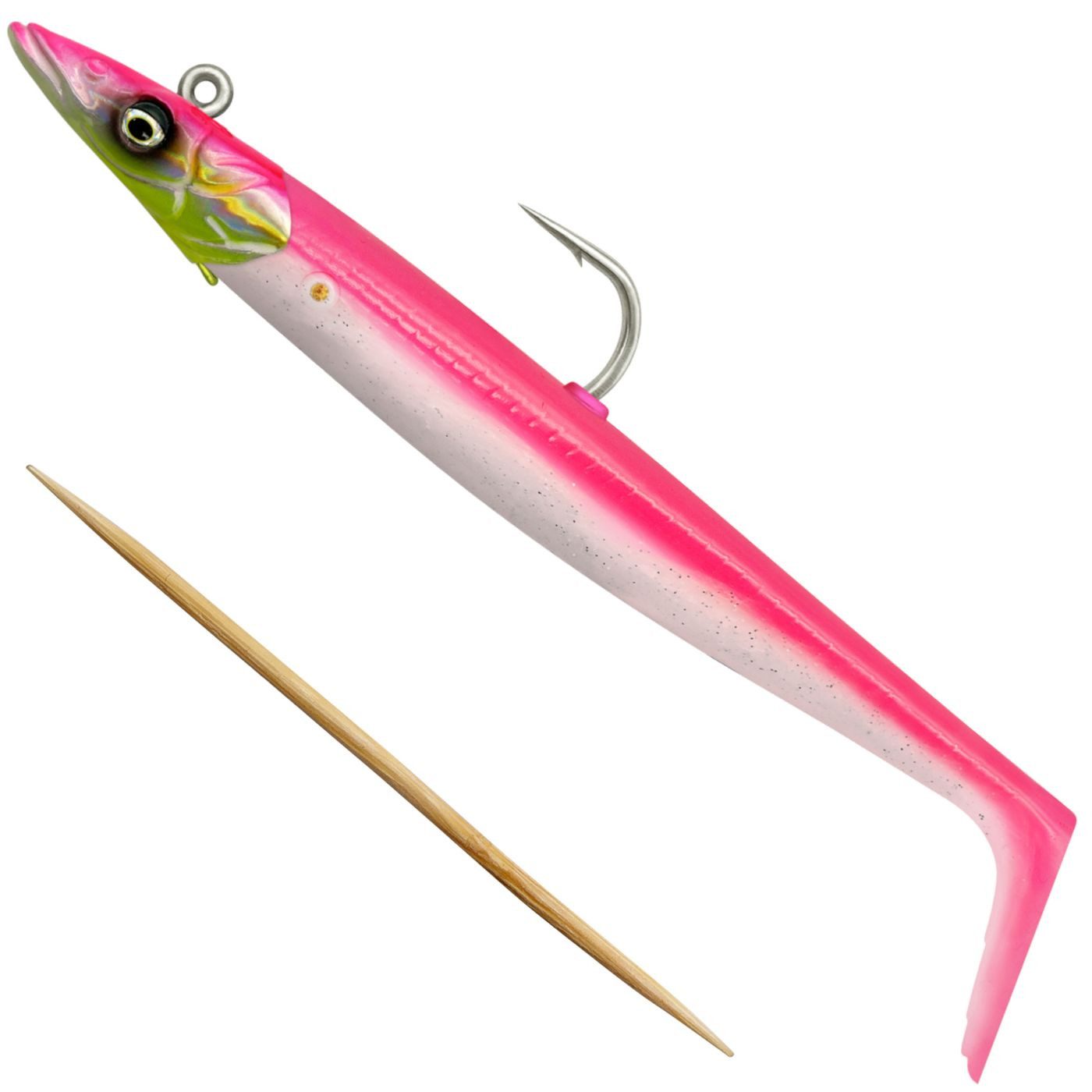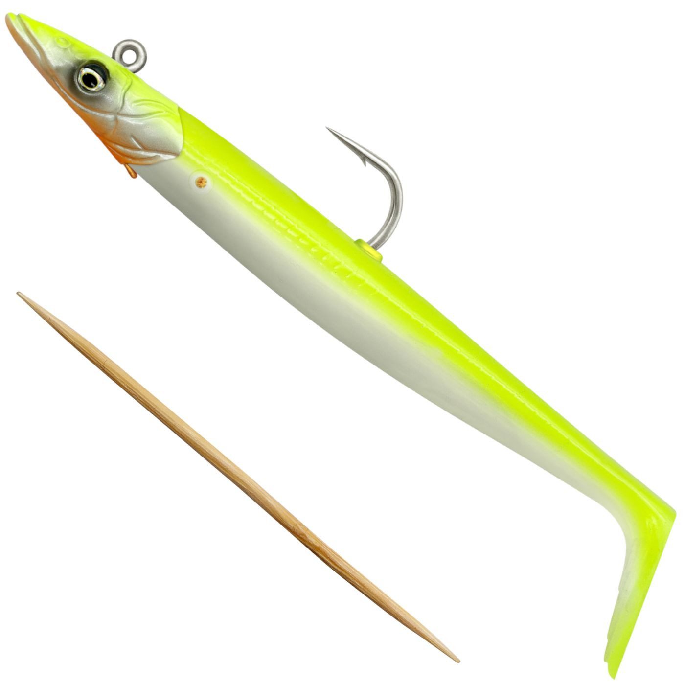 Savage Gear Sandeel V2 - 2 Gummifische + 1 Jigkopf- Der Kunstköder von Savage Gear ist eine realistische Sandaalimitation mit lebhaft schlagender Aktion, sowohl im Absinken als auch beim Anziehen, der selbst die vorsichtigsten Räuber zum Anbiss verlockt. Der einzigartige Rise & Stand Up-Jigkopf sorgt für einen attraktiven Lauf: Der Köder steigt auf Zug hoch und steht am Grund aufrecht. Der Pro Peg-Körperhalter ermöglicht es, den Körper per Zahnstocher am Kopf zu sichern. Der weiche Kunststoffkörper ist mit einer Glasrassel vormontiert, die dem Köder einen provozierenden Klang verleiht.