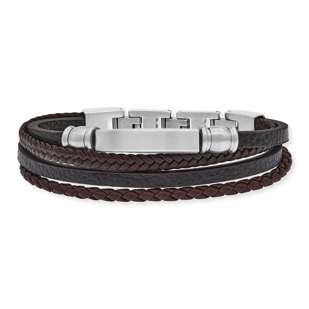 Das lässige Save Brave Armband besteht aus vier verschiedenen braunen Ledersträngen und der mittlere Lederstrang hat ein Edelstahl Element in der Mitte. An dem Edelstahl Element ist eine Art Gravur Element angebracht, welches auf Wunsch personalisiert werden kann. Bei dem Klappverschluss können Sie das mittlere Element entfernen und können somit das Leder Armband kürzer tragen. Mit diesem modernen Save Brave Armband haben Sie ein lässiges Accessoire für jeden Anlass.