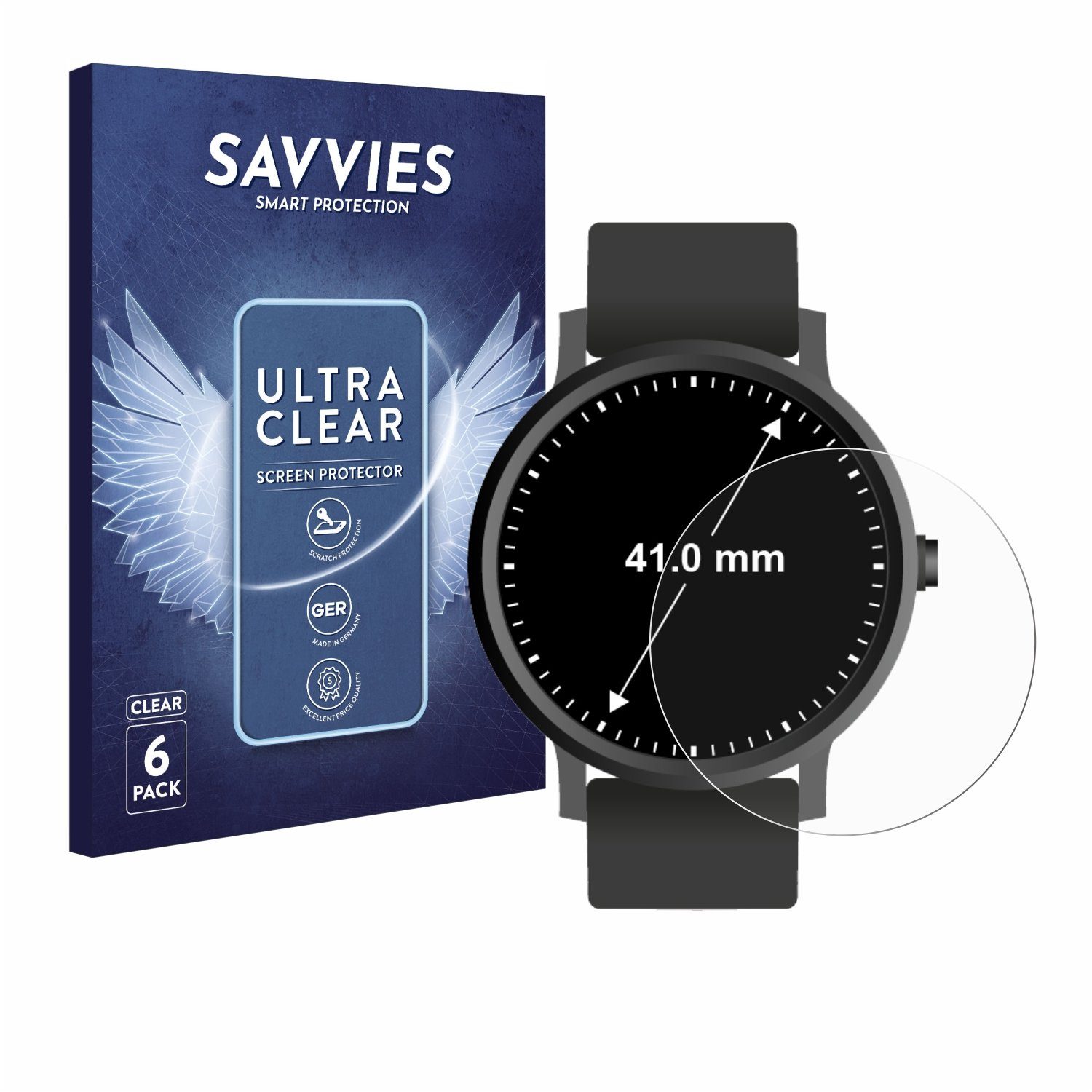 Lieferumfang | 6x Savvies Displayschutz-Folie kompatibel mit Armbanduhren (Kreisrund, ø: 41 mm) (6x Display). |