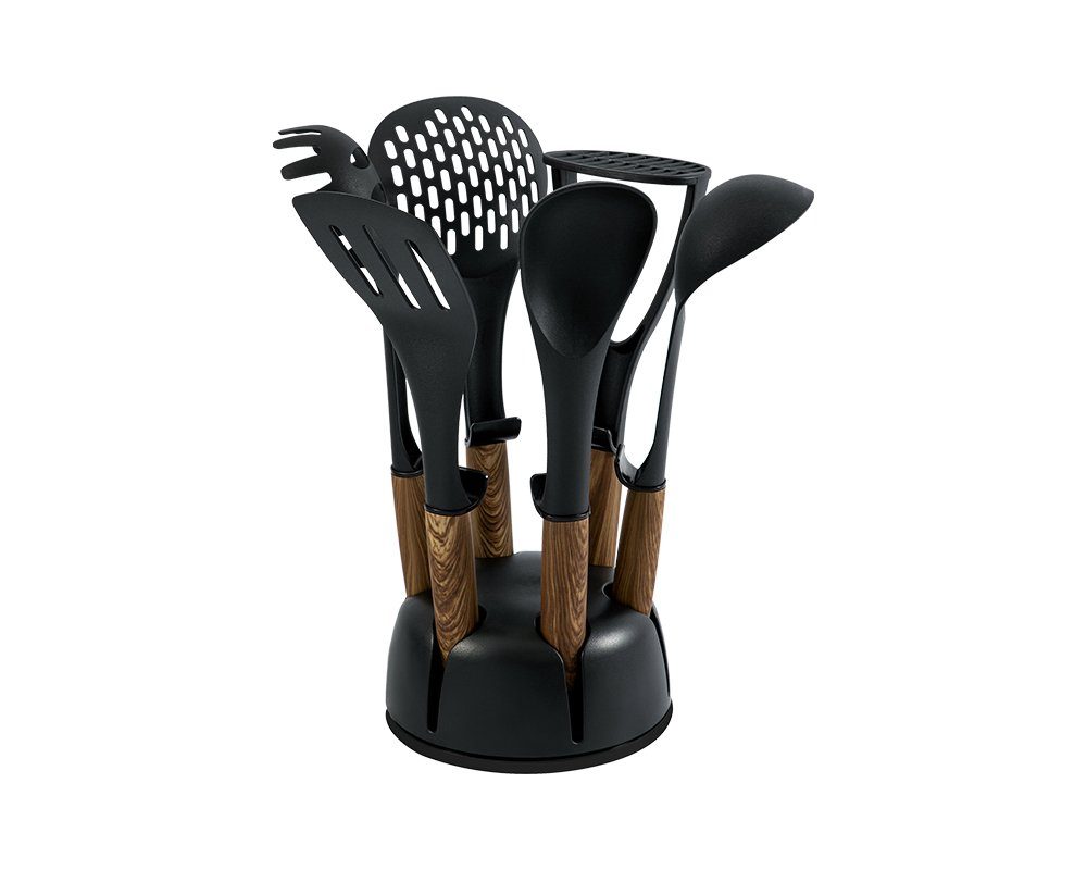 Das Set besteht aus 2 Servierlöffeln, einem Spaghettiheber, einer Schöpfkelle und zwei Pfannenwendern inklusive dem Ständer.