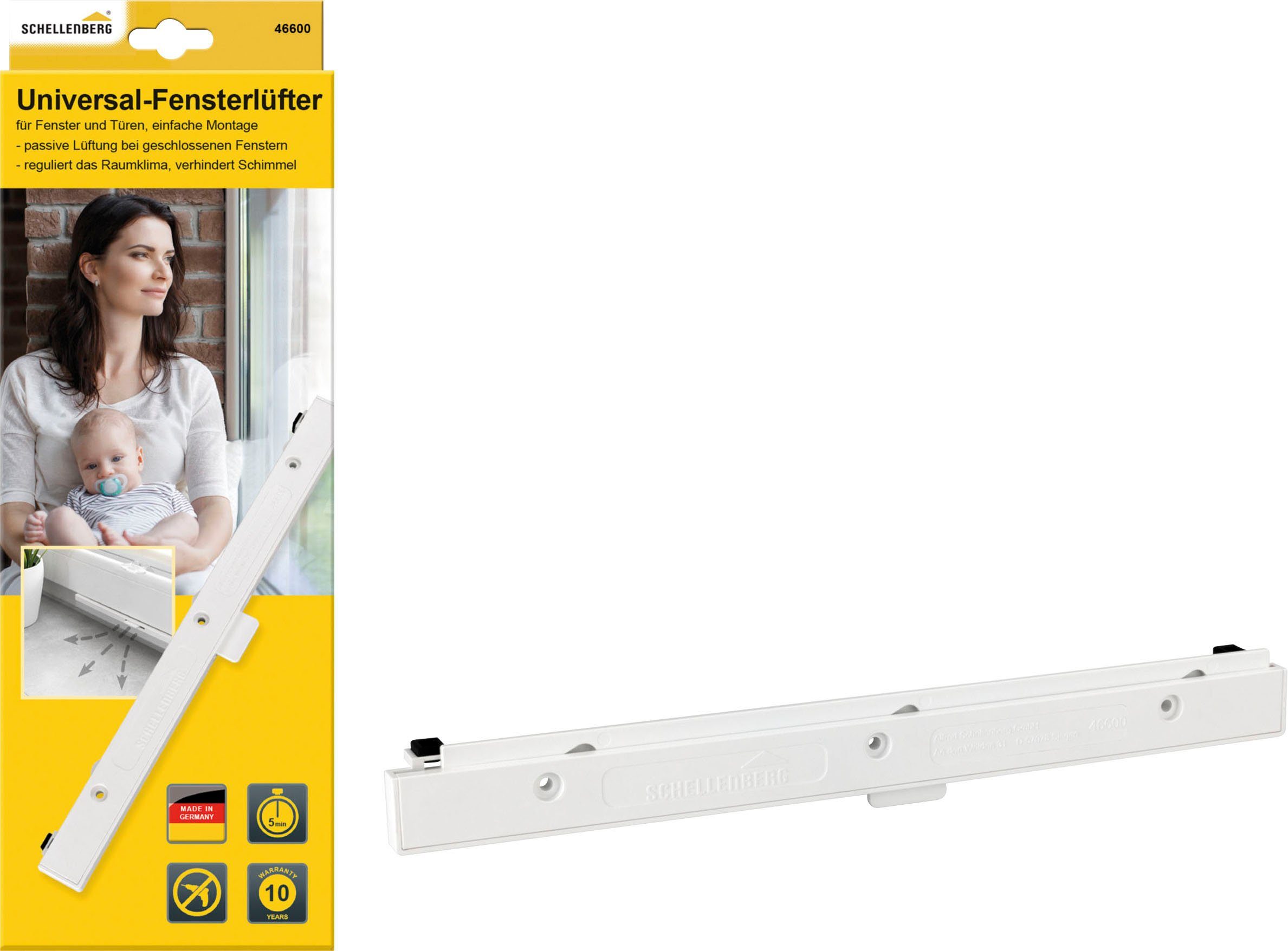 Die Schellenberg Universal-Fensterlüfter sorgen für ein gesünderes Raumklima, trotz geschlossener Fenster oder Türen. Mithilfe eines ständigen Luftaustauschs reduzieren sie die relative Luftfeuchtigkeit sowie Schadstoffe in der Raumluft. Die kontinuierliche Feinlüftung, beugt der Schimmelbildung an Fenstersimsen vor und gibt feuchten Wänden ihre ursprünglichen Dämmeigenschaften zurück. Durch die verbesserte Raumluft wird weniger Energie zum Erwärmen der Räume benötigt, wodurch Sie zudem Heiz- und Energiekosten einsparen können.