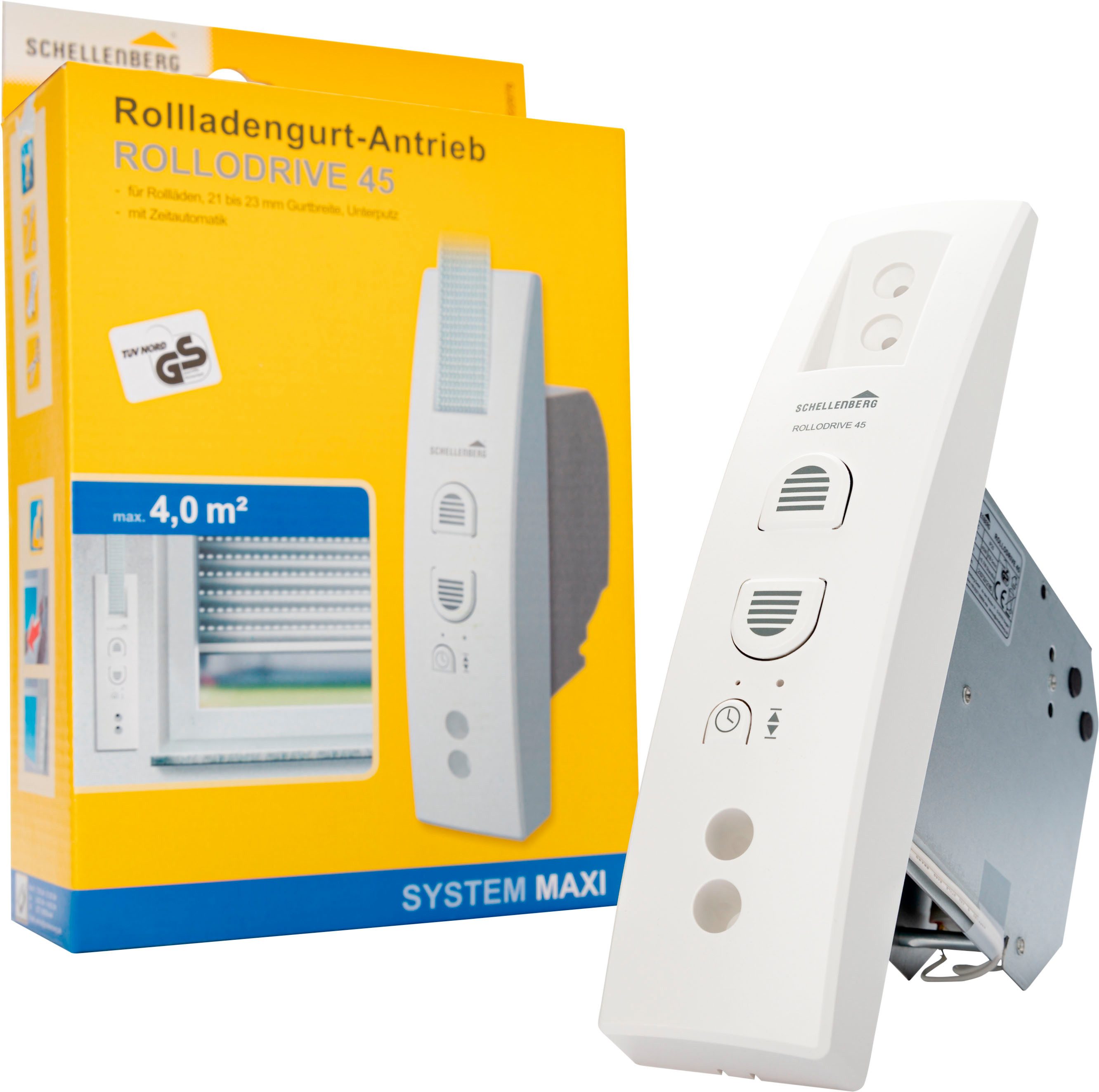 Der Schellenberg RolloDrive 45 ermöglicht die Bedienung eines Rollladens bequem per Knopfdruck oder Zeitautomatik. Der elektrische Gurtwickler ist für Kunststoff-Rollläden bis zu einer Fläche von 4 m² geeignet und kompatibel mit dem Rollladensystem Maxi mit einer Gurtbreite von 23 mm. Er ersetzt einen vorhandenen mechanischen Gurtwickler vollständig. Der RolloDrive 45 kann in alle gängigen Mauerkästen mit einer Öffnungsbreite von mindestens 35 mm und einer Höhe von mindestens 103 mm verbaut werden. Er hat zwei Lochabstände von 135 mm bzw. 165 mm. Der elektrische Gurtwickler ist ideal für Mietobjekte geeignet, da für den Einbau das Öffnen des Rollladenkastens nicht notwendig ist.