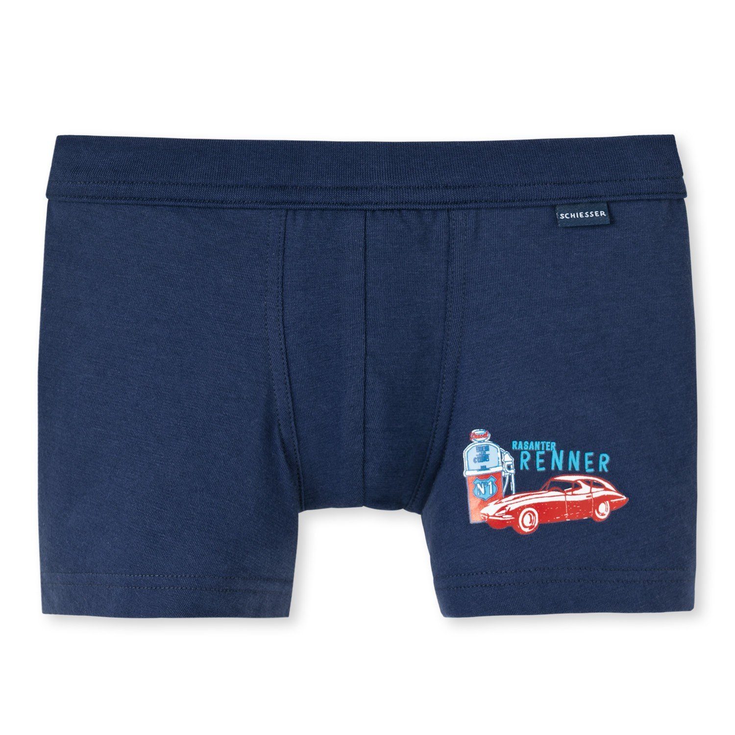 Diese dunkelblauen Jungenshorts sind genau das Richtige für kleine Autofans! Ein feuerroter Rennwagen auf dem linken Bein steht an einer coolen Zapfsäule zum Tanken bereit und wird mit dem Schriftzug "Rasanter Renner" prima in Szene gesetzt. In elastischem Single Jersey fühlen sich die Shorts nicht nur wunderbar weich an, sondern machen zudem jeden Spaß garantiert bequem mit. Ein echtes Lieblingsstück in bester SCHIESSER-Qualität. Mit tollem Automotiv am linken Bein: roter Rennwagen, Zapfsäule und Schriftzug "Rasanter Renner", kleines SCHIESSER-Label am Bund, in herrlich softer, elastischer Single-Jersey-Qualität.