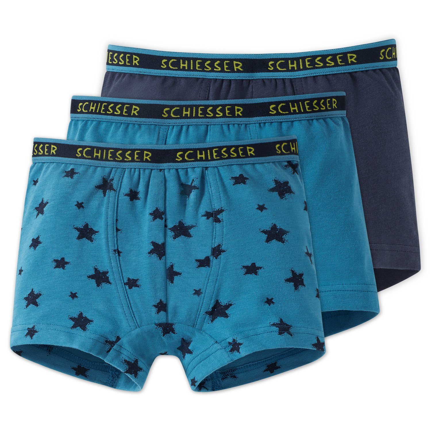 Der gestreifte, blau-gelbe Logo-Webgummibund setzt das bequeme i-Tüpfelchen. Genau das Richtige für fröhliche Jungen, die die Welt am liebsten in bester SCHIESSER-Qualität für sich entdecken. In Blau, in Dunkelblau und in Blau mit Sternchen-Alloverprint, alle drei Shorts mit dunkelblau-blau gestreiftem Webgummibund und "SCHIESSER"-Schriftzug in Gelbgrün, in herrlich bequemer, elastischer Single-Jersey-Qualität.
