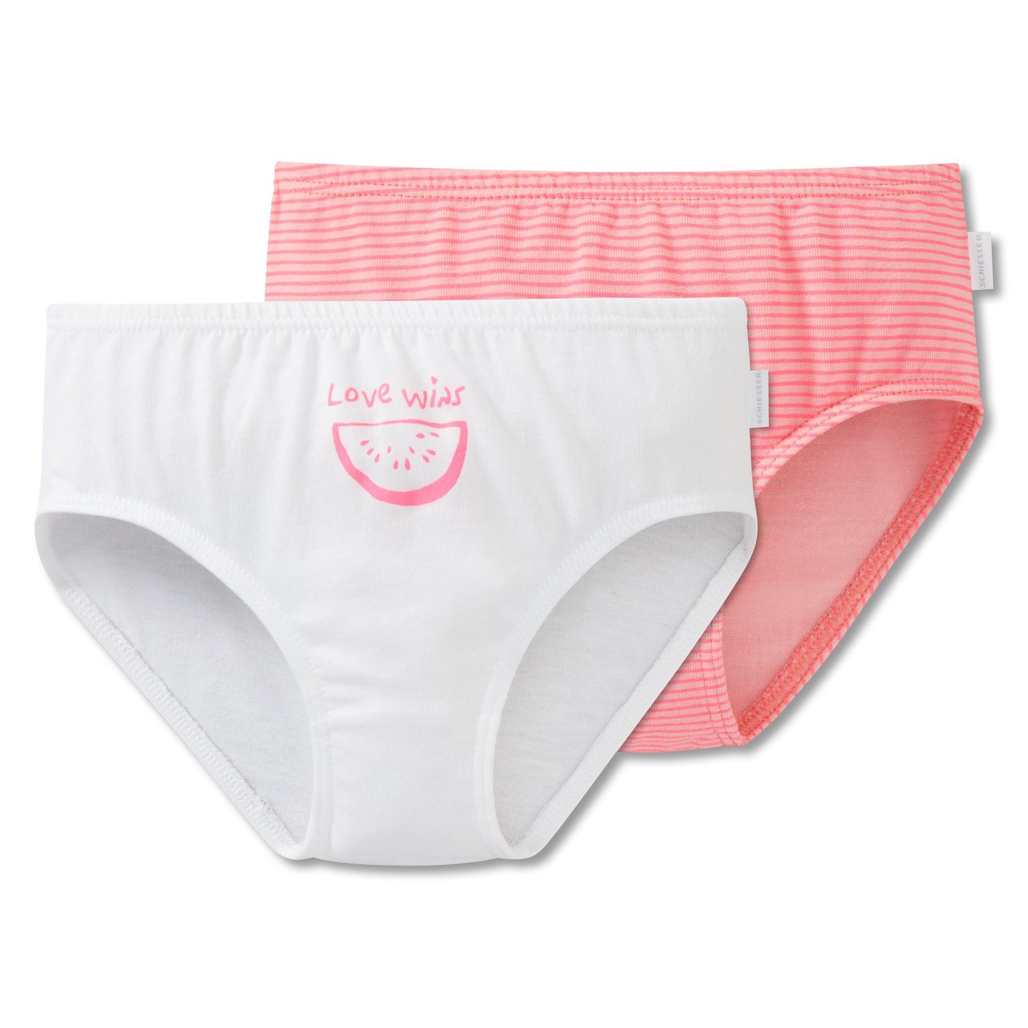 Diese hübschen Slips für Mädchen sind frisch, farbenfroh und fruchtig! Auf der apricot-farbenen Unterhose strahlt ein Ringelmuster in Neon-Pink und sieht einfach nur bezaubernd aus. Die weiße Варіанти begeistert mit einem kontraststarken Melonen-Print und fröhlichem Spruch "Love wins". In super bequemen Single Jersey und in bester SCHIESSER-Qualität fühlt sich die Wäsche herrlich auf der Haut an und lässt im praktischen Doppelpack alle Herzen höher schlagen. Slips für Mädchen im praktischen Doppelpack, aus der SCHIESSER-Serie "Summer Mood", in Apricot mit feinem, gedrucktem Ringel-Muster in Neon-Pink, in Weiß mit pinken Melonen-Motiv und Schriftzug "Love wins", beide Unterhosen tragen jeweils ein weißes SCHIESSER-Label an der Seitennaht, in angenehm weicher Single-Jersey-Qualität.